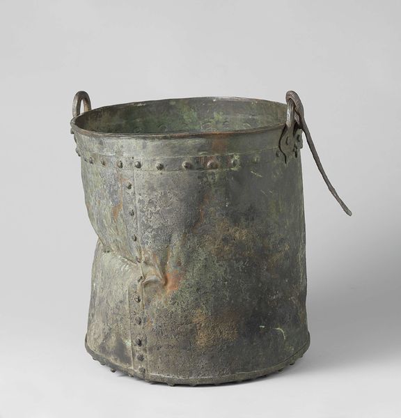 Curator: Right, let’s dive into this intriguing object. What strikes you first about this “Powder Chest,” dating back to 1845 and created by Enthoven & Co.? Editor: Honestly? It looks like a sad robot vacuum that’s given up on life. That cold, gray metal…it's got a real melancholic vibe. The rope handles are a weirdly rustic touch, juxtaposed against the industrial feel. Curator: Precisely! This chest speaks volumes about 19th-century industrial Romanticism and anxieties concerning warfare. The chest, constructed of metal, highlights the rise of industrial materials being integrated into everyday life—but consider the implications during a period marked by conflicts, colonialism, and power struggles. The use of metal reflects not only practicality, in containing gunpowder, but also symbolizes strength and a stark detachment from nature. Editor: Detachment indeed! It’s got this “hands-off” energy. The rope handles, though, are fascinating. It makes me wonder about the person who physically hauled this thing around – all that weight. Was it a subtle way of highlighting the invisible labor? Curator: Absolutely. Consider that while mass production sought to render labour invisible, certain Romanticist ideals ironically glorified "heroic" masculine forms, indirectly acknowledging such exertions of force within society. The object also becomes symbolic in that very moment; it isn’t just a functional container. Editor: I am getting a strange contrast between practicality and looming disaster, I see that Romantic sensibility you mentioned earlier; the beauty and the dread mingle, like a stormy sky painted on a missile. It's strangely poetic in that sense! Curator: Exactly. And let us contextualize it further within sociopolitical power. This powder chest—what does it defend? Whose interests does it uphold? The materials, the design—everything serves to bolster and reinforce colonial authority. Editor: Deeply sobering when you put it that way. Makes you think about all the hidden labor and ideologies tucked away in simple, everyday objects, huh? Curator: Exactly. So even something as ostensibly functional as this powder chest resonates with significant cultural and historical complexities—allowing for deeper reflection than we might expect at first glance. Editor: Totally. I came in thinking gloomy robot, I’m leaving thinking…powerful, depressing historical artefact. That’s quite the journey.