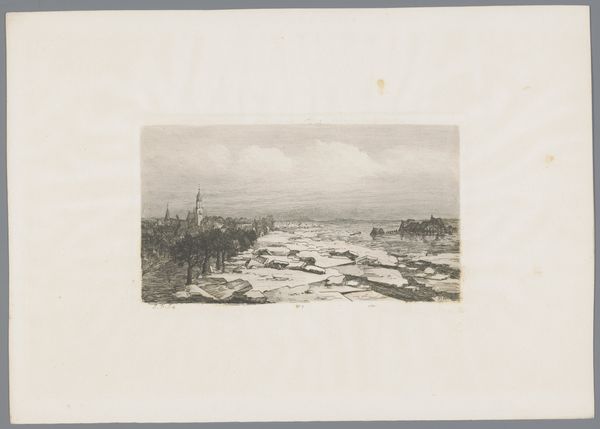Curator: Brrr, even looking at this photograph gives me the shivers! W. Visser captured "Ice Floes in a River, Netherlands" sometime between 1910 and 1940 using a gelatin silver print. Editor: Cold is right. But I’m seeing a really intriguing landscape...almost abstract. All those broken forms and fractured reflections, it's chaotic and still, all at once. It’s a whole theater of texture—the granular snow and the reflective quality of the ice itself. Curator: Yes, that stillness is striking. I find myself thinking about how these rigid shapes are impermanent, just floating along… They're at the mercy of the current. Do you see how small the figures on the largest ice floe seem, against that somber sky? Editor: The figures? You're right, they seem almost like an afterthought. For me, the material tells a richer story. Gelatin silver prints were a standard of photography at that time, celebrated for their archival quality, which also suggests ideas about industrial progress and labor. These "slices of light" captured by the labor of many... Curator: Precisely, the photographer and then everyone involved in developing, printing. This photograph is not just a depiction, it's a physical object too. Editor: It reminds us that even what seems like a solitary image – a landscape in winter – is embedded in human industry and social exchange. You know, each choice—from gelatin to silver—carries its history and the context in which it was manufactured and valued. Curator: It all really ties back to the sense of melancholy, doesn't it? The beauty and fragility. Looking at the tonality, the infinite range of greys... it is very moving. The monochrome palette highlights these tensions, turning fleeting winterscapes into timeless contemplation on resilience, loss, or quiet persistence. Editor: Absolutely. Next time, I’m wearing gloves! Curator: Perhaps, earmuffs as well.