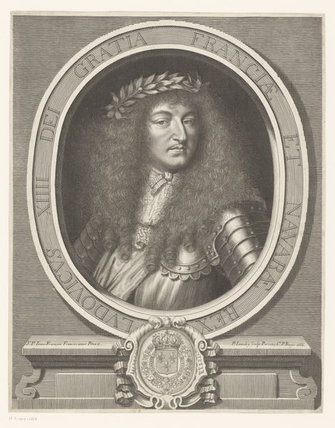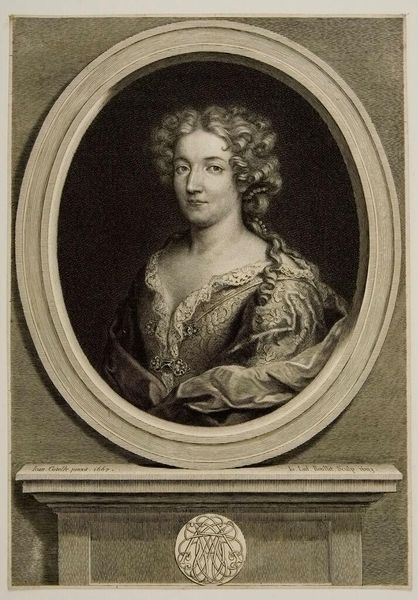Editor: So, this is Robert Nanteuil's engraving of Marie-Jeanne-Baptiste de Savoie-Nemours, Duchesse de Savoie. It's quite formal. What strikes you about its historical context? Curator: Well, it's interesting how Nanteuil, as a prominent portrait engraver, helped shape the public image of figures like the Duchesse. Consider how prints like these circulated, reinforcing and disseminating specific ideas about power and nobility. What do you think the inclusion of the coat of arms signifies? Editor: Perhaps it's a declaration of her lineage and authority? Curator: Precisely. And think about the role of such images in constructing and maintaining social hierarchies. These weren't simply artworks; they were powerful tools in the theatre of politics. Has looking at it this way changed your perspective? Editor: Definitely, I see it as less of a portrait and more of a carefully constructed political statement. Curator: Exactly! It’s a fascinating example of how art serves a purpose within a broader socio-political landscape.