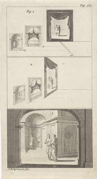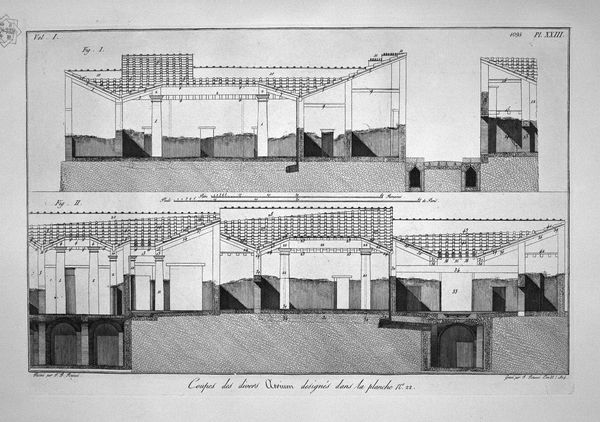 Curator: This drawing, “La Perspective Pratique. Seconde Edition. Part I, II, and III,” was created in 1679 by Jean Dubreuil. It’s a fantastic example of the architectural engravings being produced at the time, focusing on perspective. What's your first take on it? Editor: Stark, almost unsettling in its clarity. That rigorously gridded floor leading to an almost featureless doorway... it evokes a sense of infinite potential, but also, let’s be honest, a touch of existential dread. Like stepping into a meticulously rendered void. Curator: That's interesting. I find that the void, as you call it, invites the viewer to fill the space with their own imaginings. For example, it feels as if there is stage being set and the characters will shortly emerge. The geometric structure gives permission to dream. What symbols do you interpret from the visual language? Editor: Geometry itself carries weight. Grids, historically, symbolize order, control, a triumph over nature's chaos. That doorway at the vanishing point could symbolize any portal--but that feels a bit easy here, it is probably a doorway. Yet here it could equally signify possibilities within architecture and learning through design. Curator: A kind of enforced or instilled idea that through the study of architecture an individual finds enlightenment? Is that it? And notice the strong, repetitive horizontals of the exposed ceiling beams—the architectural bones—it is like you can almost see what binds our interior thoughts to external design? Editor: Precisely! Think of the emotional impact that repetitive structure. Like looking up at a framework, something akin to societal architecture or the human rib cage. Dubreuil isn't just showing us *how* to draw perspective; he’s showing how perspective and geometry fundamentally construct our world views. The perspective offers a feeling, or an ideal, about perfection; that with geometry one can create perfection. Curator: Yes, there’s a cerebral quality. Perhaps the cold reading reflects a deep trust in scientific precision during a burgeoning Age of Reason? But I’m compelled by how its simple austerity ignites thought. Thanks to Dubreuil’s craft, we now engage with the world not just as artists, but as explorers of the mind. Editor: I am inclined to agree; the Age of Reason must have seemed terribly fraught without emotion. To engage as an artist, one would naturally lean on reason as something concrete.