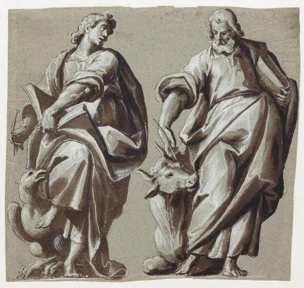 Editor: Here we have "Zwei beieinander stehende Männer, der linke im Philosophenmantel mit weisender Geste, der rechte als Feldherr" attributed to Palma il Giovane, rendered with pencil, ink, charcoal and gouache on paper. What immediately strikes me is the contrast between the active lines of the philosopher on the left, compared to the more static and solid forms of the general. What compositional elements jump out to you? Curator: The most compelling formal element is, indeed, the tension created through contrasting textures and line qualities. The philosopher’s garments are articulated with fluid, almost frenetic lines, suggesting movement and intellectual energy. By contrast, the general's armour, rendered in darker, more consistent tones, evokes a sense of stability and stoicism. Note the use of chiaroscuro to sculpt the forms; where do you see the light falling and what effect does it create? Editor: I see the light catching mainly on the high points of the drapery and armor. This technique really accentuates the volume of their forms and highlights the texture differences. Do you think that this work suggests anything about the relationship or hierarchy between philosophy and military strength, given their different treatments? Curator: Perhaps. From a purely formalist standpoint, consider how the artist has constructed the spatial relationships. The philosopher's dynamic pose and gestural language draw the eye and occupy more visual space. This can be seen as a device to foreground the value of intellectual discourse over martial power. However, the robust lines of the general create weight, acting as a counterbalance. Do you feel that it makes the drawing compositionally stable? Editor: I see your point! The general provides that much-needed anchor. I initially focused on the differences, but looking closer, the subtle similarities in their facial features create a visual echo that binds them. I also think that the use of blended media creates a unique look here. Curator: Exactly. The blending of these media contributes to a unified visual experience, emphasizing formal harmony even amidst contrasting elements, while creating greater opportunities for dynamic contrast. Editor: I hadn't considered how the composition speaks to this harmony as much as the contrast. Thank you for this view.