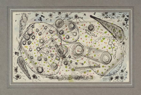 Curator: We are looking at Mark Rothko’s “Abstract Composition,” created circa 1944. Executed in watercolor, this piece displays Rothko's developing interest in organic abstraction. Editor: It feels so unresolved to me. There is a strange push-and-pull quality in the arrangement of biomorphic shapes; the high-key colors evoke a dream-like sensibility, a pastel battleground, if you will. Curator: Observe how Rothko divides the composition into distinct horizontal zones. Notice the upper register with its warmer, muted tones—peach, cream, and faded yellow—resting atop the cooler blues and grays of the lower section. Editor: What strikes me are the floral motifs interspersed with forms suggesting seed pods and nascent figures. Knowing this work comes from the mid-1940s, it's hard not to read these emerging forms as suggestive of the struggle for new growth and the search for collective renewal after immense global trauma and suffering. Curator: Indeed. Before his signature color fields, Rothko explored the boundaries of representation through abstraction, using these semi-figurative shapes. The linear elements serve to unite and delineate, forming an integrated visual structure. See how the central cascading form acts as an anchor for the looser, gestural marks around it. Editor: Considering his peers were mostly interested in a heroic, grand-scale masculine vision, Rothko’s foray into softer, almost domestic imagery is somewhat surprising, and very much in keeping with similar efforts of women artists like Lee Krasner and others exploring identity, the domestic, and interiority in the context of a gendered postwar experience. The medium itself, watercolor, also evokes a softness which pushes against any rigid interpretations of his work. Curator: His use of watercolor allows for a unique luminosity and fluidity. The bleeding of colors and the transparency achieved create layers of depth and visual texture, and serve the function of adding an element of structural complexity to what at first seems to be random biomorphic expression. Editor: In its seeming chaos, there's a call for reconstruction, a quiet but assertive hope. I’m struck by Rothko's attempt to visualize hope through his exploration of fluid, organic forms. Curator: A poignant point, reflecting on the inherent tensions and search for structure inherent in this transitional piece. Editor: This conversation has shifted my thinking around this work.