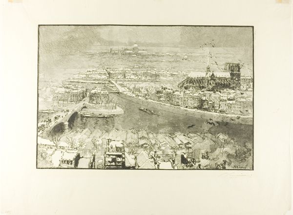 Curator: Maxime Lalanne's "View from the Viaduct of Point du Jour," created between 1870 and 1871, is an etching that offers a panorama of urban life. Editor: My first impression is one of industrious melancholy. The sheer amount of detailed activity, rendered in muted tones, speaks of labor, but with a certain wistful detachment. Curator: Indeed. Note how Lalanne employs linear perspective and hatching to define spatial depth. The density of the lines suggests an environment teeming with activity, yet the monochromatic palette unifies the scene, emphasizing tonal relationships. Semiotically, the image signifies the dynamism of a changing cityscape. Editor: I can’t help but consider what that "dynamism" signifies beyond the aesthetic. The industrial growth represented here likely came at the expense of marginalized communities and the environment. The rising smoke stack isn’t merely compositional—it's an assertion of industrial power, shadowing the river and the lives dependent on it. Curator: While your interpretation has validity, I would posit the structure created through light and shadow organizes chaos and contributes to the harmony. His skillful rendering transforms industry into an artful study of contrasts and forms. Observe how lines delineate shapes, contributing to a structured composition where aesthetic choices override social critiques. Editor: But can we genuinely separate aesthetic enjoyment from the artwork's participation in ideological narratives? The print medium made such imagery widely accessible; did Lalanne reflect on the message being broadcast? Who benefits when industry romanticizes and neutralizes exploitation? It calls into question whose gaze truly matters. Curator: Your perspective invites crucial socio-political discussion, even if Lalanne’s immediate intent might've been purely artistic expression through technical mastery and precise execution. He was certainly concerned with visually capturing industrial growth, but through careful composition of dark and light. Editor: Right, the power dynamics represented within, the artist framing this view—they shape our experience as well. These visual remnants help inform contemporary discussions concerning exploitation during periods of rapid expansion. It's so valuable. Curator: Precisely. Understanding the piece formally enhances appreciation, even considering alternate interpretations.