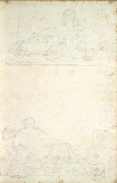 Curator: This drawing, attributed to an anonymous artist, depicts the Capitoline Tiber and Capitoline Nile. Editor: They look so languid, almost melancholic. The reclining poses feel heavy with symbolic weight. Curator: Absolutely, rivers as gods were potent symbols of power and prosperity, especially in the context of the Roman Empire's expansion and control. The appropriation of the Nile speaks volumes about Rome's political ambitions. Editor: Indeed, these aren't just rivers; they're representations of conquered lands, molded into the Roman visual lexicon. It's a fascinating example of how art becomes a tool for legitimizing dominance. Curator: And the stylistic choices, even in this preliminary sketch, reinforce the sense of classical authority and enduring legacy. There's a calculated timelessness here. Editor: Seeing them together makes one wonder what kind of dialogue, or perhaps power dynamic, the artist was trying to convey. Thanks for sharing this.
