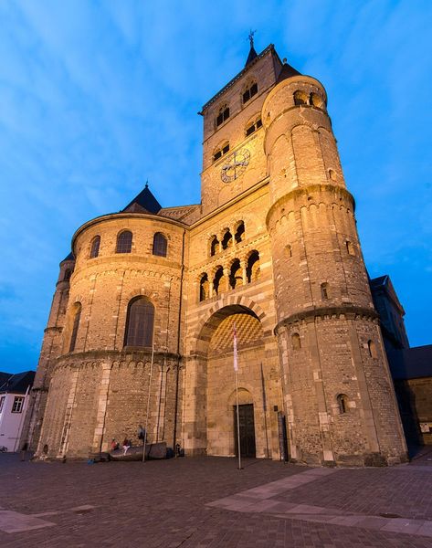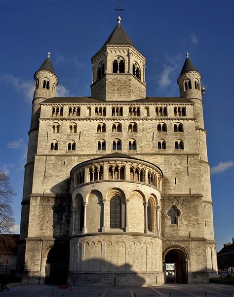 Curator: Immediately, I sense a powerful groundedness. It is as if the stone itself rises organically from the earth, its geometric simplicity echoing the very structure of the landscape. Editor: We're looking at a photograph of the West End of Maria Laach Abbey in Germany. Construction on the Abbey began in 1093, which means it's a key example of Romanesque architecture in the region. Curator: Observe the facade's strict symmetry and repetition of rounded arches; elements meticulously aligned to direct the eye upward, to divine realms, yet held in check by horizontal lines that firmly root it. Editor: Maria Laach Abbey wasn't just a place of worship; it was a center of knowledge and influence, particularly within the Rhineland. The church's construction reflects the wealth and power of its patrons and the wider socio-political forces at play in Medieval Europe. Curator: Consider the materiality; the weight and texture of each stone speaks volumes. The color palette is kept simple: beige tones, a mix of browns and greys. There is a sort of tactile visual effect as you analyze the patterns of the architectural decisions here. Editor: Indeed, and let’s consider how imagery of the building itself – such as this photograph – served to reinforce the Church's authority, emphasizing its enduring presence through careful framing and idealized depiction for different forms of social validation. Curator: And yet, its power rests also on the interplay of light and shadow. The rhythmic series of windows are not simply openings but sculpted voids defining spatial volumes. Editor: I agree. Studying buildings like Maria Laach helps us to understand the past, reflecting on present social stratifications while we consider artistic forms of expressions across time. Curator: It invites a contemplative space for reflections. Editor: And on history that created such space in the first place.