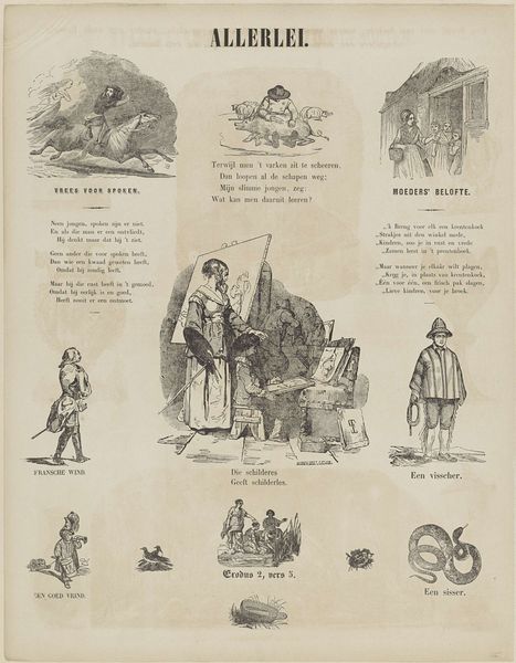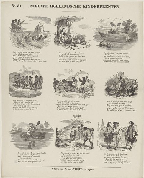 Curator: This print, titled "Ambachten, bedrijven" – Trades, Businesses – whispers to us from somewhere between 1861 and 1929. What strikes you about it, knowing that A.W. Sijthoff was the artist behind this bustling tableau of professions? Editor: It's like a snapshot album of professions, each one carefully arranged. I’m drawn to how each panel is accompanied by text, almost like little poems. What kind of story do you think it’s trying to tell? Curator: That's a wonderful way to put it – a snapshot album! It feels like an ode to labour, doesn’t it? Each vignette seems to not only show *what* these people do, but perhaps also speaks to the dignity and the inherent value of their contributions to society. See how the figures are placed centrally, bathed in light almost as if they're tiny heroes in their workshops? Editor: Now that you mention it, yes. They do seem important in their worlds, their labour the focus, not just decoration. Why do you think there's text accompanying each image? Curator: Ah, that's the heart of it, isn’t it? Perhaps the text served as moral lessons tied to each trade, offering guidance. What lessons would these little scenes teach to the community that was viewing them back then, do you think? Editor: That's fascinating! The text, in addition to showing the importance of trades, also gives lessons. I guess, art was trying to serve the population? It is so different to today's purposes. Thank you for the great perspective! Curator: And thank *you* for asking the right questions! It’s pieces like these that remind us art always has a pulse – that echoes with the lives, dreams and values of a moment in time.