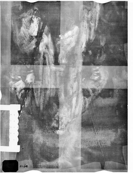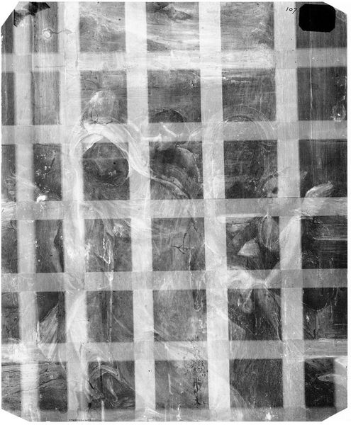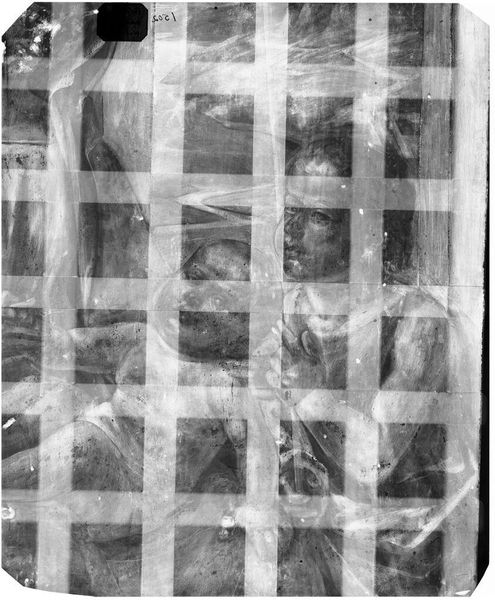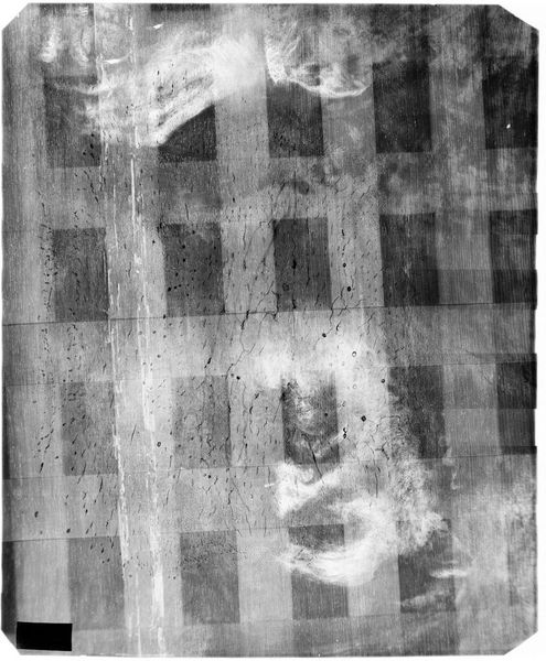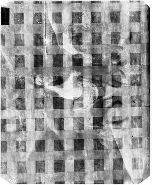 Editor: This is an X-radiograph of "Madonna with Child" by Bartolomeo Montagna. The stark blacks and whites give it such an eerie feel, and the grid-like pattern across the surface is very striking. What do you see in this piece? Curator: The radiographic process reveals the density and layering of the materials. Note how the lead white, used extensively in the original painting, appears opaque, defining forms through tonal contrast. The composition itself, though mediated by technology, retains a classical structure. Editor: So, the X-ray highlights the physical structure, almost like an abstracted version of the original? Curator: Precisely. It encourages us to consider the materiality of the artwork, how the artist built up the image layer by layer, and how that physicality contributes to our understanding. Editor: Fascinating. I never thought about analyzing an X-ray in terms of composition. Curator: Indeed, it provides a unique perspective on artistic intent and execution.