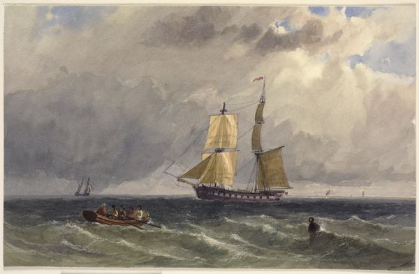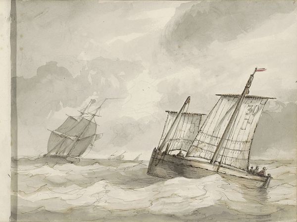 Editor: Here we have "Ein Segelschiff auf hoher See," or "A Sailing Ship on the High Seas," created around 1850 by Ivan Konstantinovich Aivazovsky. It appears to be a drawing using pencil, ink, and watercolor on paper, currently housed at the Städel Museum. There's something haunting about the limited palette... the monochromatic shades of sepia, almost. How do you read the visual structure of this work? Curator: Note the interplay between the geometric rigidity of the ship and the fluid, almost chaotic, rendering of the sea and sky. The artist’s precise linework in depicting the vessel contrasts sharply with the blurred washes of color used to create the turbulent waves and overcast atmosphere. It's a fascinating dynamic, isn't it? Editor: It is! What’s the effect of this contrast in textures? Curator: By employing such different techniques within a single composition, Aivazovsky establishes a visual hierarchy. Our eye is immediately drawn to the ship, a symbol of human ingenuity and perhaps even ambition, while the sea, rendered in softer, more yielding forms, acts as both a stage and a force against which this vessel must contend. Do you perceive a sense of scale here? Editor: Definitely. The ship seems small against the immensity of the ocean. It feels both vulnerable and resolute. I see it's titled as a drawing, yet there's a strong painterly quality to the waves. Curator: Indeed. He has masterfully exploited the textural possibilities of watercolor to create a sense of depth and movement. The graded washes suggest the constant motion of the water, almost vibrating before us. Considering all of these choices – texture, scale, light, shape – what underlying structure are you seeing? Editor: I see what you mean; considering his emphasis on contrasts, this is more than just a sketch, it's a fully formed study in Romantic tension. The sea as raw power versus the ship’s delicate geometry. Curator: Precisely! It becomes clear that Aivazovsky isn't merely depicting a ship; he's exploring fundamental dichotomies through the very syntax of artmaking.