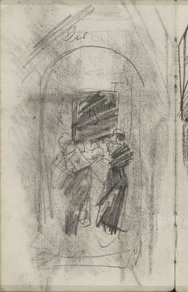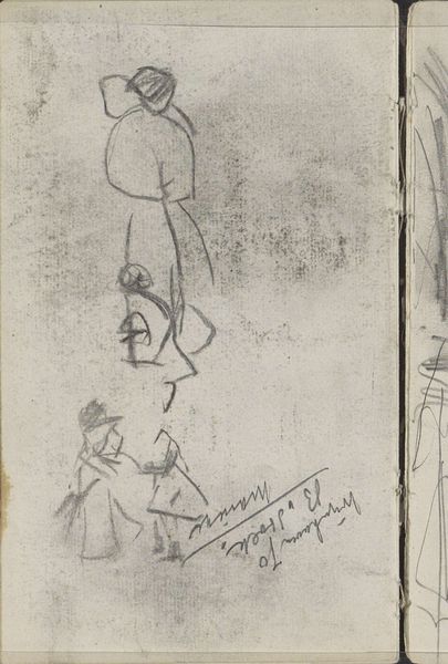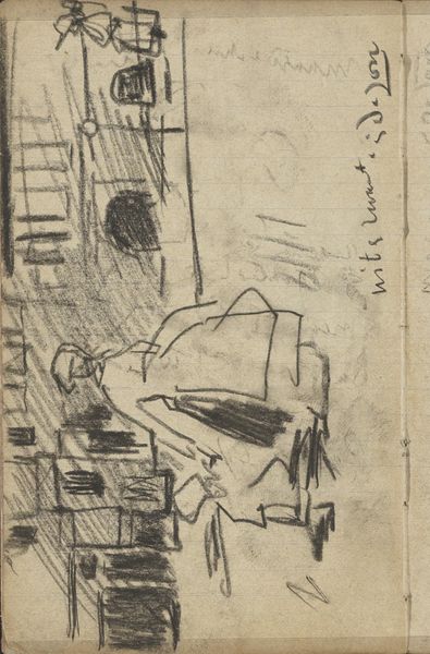 Curator: George Hendrik Breitner's drawing, "Mannen aan tafels, onder andere Van Hall," created around 1895-1898, is currently held here at the Rijksmuseum. The work renders men seated at tables and it appears to be done in pencil. Editor: Immediately, the rapid strokes and incomplete forms evoke a sense of transience and urgency. It feels like a fleeting moment captured on paper. Curator: It does. Breitner was known for capturing the raw energy of urban life in Amsterdam, and this drawing seems to exemplify that. Consider how the subjects are presented: figures sketched in informal settings. Do you feel that this contributes to a sense of authenticity? Editor: Definitely. The lack of precise details makes it less about portraying specific individuals and more about conveying the atmosphere of the scene. Notice the contrast between the darker lines defining the figures and the sparse background; it emphasizes their presence without boxing them into a space that feels completely rendered. Curator: These individuals occupy spaces but their identity is blurred within their historical context. Breitner, working during a period of significant social change, may have intentionally created ambiguity regarding these figures. The Industrial Revolution, for instance, had a profound effect on class identity in urban environments. Editor: So, is this incompleteness also reflecting the transitional nature of the period itself? Interesting. Returning to form, do you see that the dynamism of line and shadow makes up the picture, with the stark whiteness of the page as a kind of…negative space, actively contributing? Curator: The medium, pencil on paper, is critical as well. Breitner was able to produce artworks at great speed, rendering social and political scenes. The sketchlike style lends itself well to this purpose, as he was deeply involved in leftist political activism. Editor: It really makes you think about intention and medium. What is the value of conveying the historical importance of an artwork through an inherently unfinished formal method? Curator: Perhaps it’s precisely that ‘unfinished’ quality which encourages the viewer to consider all the forces, often conflicted and competing, at play. Breitner invites us to consider what elements converge in this candid vision. Editor: I see now that the drawing isn’t trying to be definitive; it’s prompting inquiry, revealing what exists as a site of contention and change, and as potential too.