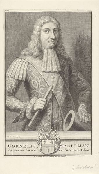 Editor: This is a portrait of Frederik Willem, Elector of Brandenburg, created between 1685 and 1693 by Andries Vaillant. It's an engraving, so a print. What strikes me is how the lettering encloses him, and how elaborately Baroque everything is. What do you see in this piece? Curator: Well, you're right, it *is* remarkably Baroque! But it's not *just* decorative excess, is it? Think about the symbols surrounding Willem. Consider how the very act of enclosing his portrait within an oval of text, almost like a laurel wreath, elevates him, doesn't it? What is the symbolic power there? Editor: I guess it's presenting him as virtuous? Triumphant, even? Curator: Exactly. The text itself reinforces this, listing his many titles and domains, cementing his importance, almost creating a verbal 'aura' to supplement the visual one. It presents not just an individual but an ideal of power, amplified by the wig, the robe and the self assured look in his eyes, of course. Have you ever thought about how power and imagery reinforce each other? Editor: I see what you mean. The image and text work together to build an impression, a narrative about his power. Like visual propaganda? Curator: Precisely. And this wasn't unique to Willem, was it? Think about the portraits of other leaders during this time and before. These carefully constructed images speak volumes about their desire for authority and their use of cultural memory, wouldn't you agree? Editor: Definitely. It’s a masterclass in image management, even centuries later. The artwork has shifted for me from decorative portraiture to calculated propaganda! Curator: Precisely. The power of these images resonate across time!