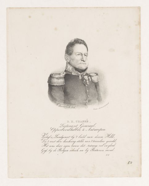 In this pencil drawing, made in 1822, Barend Zur Mühlen depicts David Hendrikus Baron Chassé, a General of the Infantry. This image offers a glimpse into the visual culture of military authority in the Netherlands. The portrait creates meaning through symbols of rank and status. The ornate uniform, complete with epaulettes and medals, signifies power and achievement within the military hierarchy. Consider how this portrait reflects the social conditions of its time. The Netherlands, having recently gained independence from French rule, was in a period of nation-building, and military figures like Chassé were important symbols of national pride. The institutional history of the Dutch military, its role in colonial expansion, and its relationship to the monarchy would provide useful context. Further research into the history of military portraiture and the visual codes of power in 19th-century Europe would help us better understand the social and institutional forces that shaped this artwork.