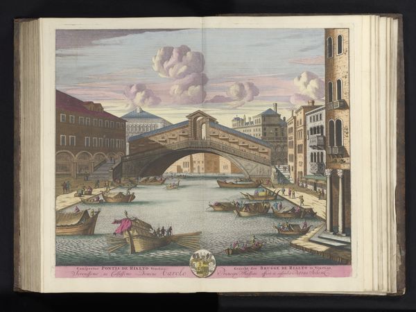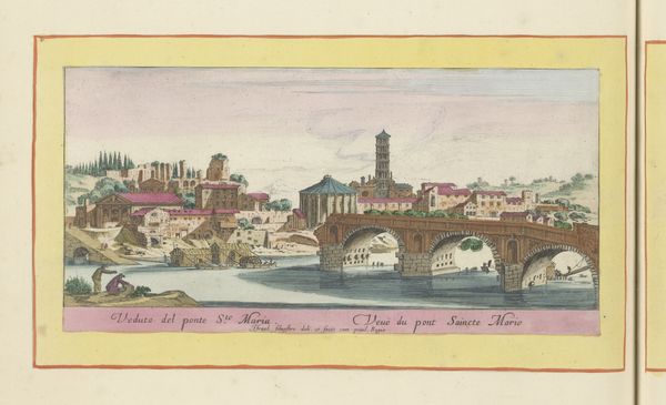 Curator: I find this cityscape strangely enchanting, a watercolor and etching entitled "Gezicht op Rouen," created before 1664 by Israel Silvestre. What are your initial thoughts? Editor: My first impression is one of tranquility, but also of human ambition. The architectural details suggest a society reaching for the heavens. The watercraft hint to stories of commerce and exploration, the river being both pathway and connector. Curator: It’s interesting that you picked up on ambition so quickly. The piece employs a clear horizon line, establishing a stable visual foundation upon which the architectonic elements are methodically organized. The use of color reinforces this structural clarity, the chromatic key modulating from cooler tones for sky and water toward warm hues in the architecture. The repetition of the arches forms an interesting set of geometric relationships that provide a good visualization of Alberti's concepts. Editor: Alberti's theories definitely resonate within the structure, yet consider how the arched bridge mirroring the sky and hillside symbolically links earthly and spiritual realms, and also how throughout history, bridges often symbolize passages or a sense of overcoming a great obstacle, a feat of construction for humans by means of material objects. Curator: True, but from a purely compositional perspective, the bridge acts as a horizontal counterpoint to the vertical thrust of the cathedral and the gently rising hill, thus giving us a strong composition. There's a delicate balance between linear precision, visible through carefully etched outlines and a textural fluidity, thanks to watercolor washes. Editor: Don't ignore the boats in the foreground—they evoke journeys, whether literal voyages for merchants or metaphorical spiritual quests. And that distant hill topped by what looks like some sort of fortification—perhaps guarding the city, acting like a silent watchtower watching over this realm of commerce. I'm curious, were prints widely available to the public at this time, in Rouen? Was this maybe an attempt to capitalize on regional pride in such structures? Curator: Silvestre probably distributed it for a wealthy elite. As prints, they could be reproduced easily, becoming quite popular with collectors, which ensured his name would have some posterity in this period. What strikes me is his subtle interplay between the structural rigidity of the city and nature, its delicate flux in form, especially in the waterscape, yet rendered through these permanent and fixed etched lines. Editor: The artist provides an interplay that immortalizes human attempts at dominating our terrestrial confines. So in this scene, we get the bridge, the buildings, even ships, as temporal achievements and then are confronted by a lasting view that emphasizes the longer term forces. This piece isn't just a landscape or a cityscape; it captures a moment where human will meets nature’s rhythm. Thank you. Curator: Indeed, thank you. This has given me some further lines of enquiry regarding the color theory in landscapes in Silvestre's other prints, which should further inform the oeuvre of the artist.