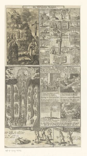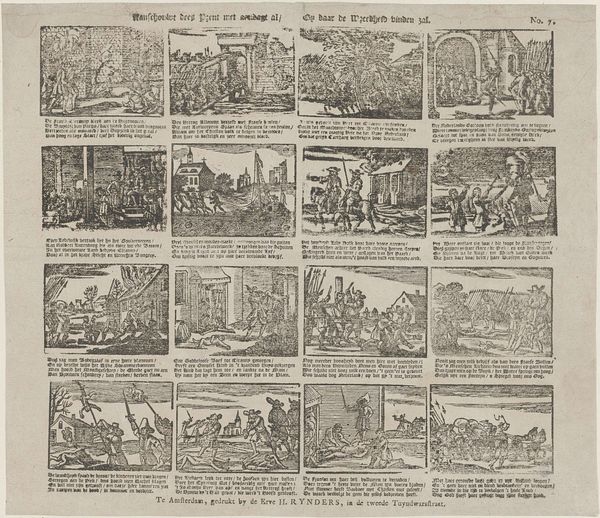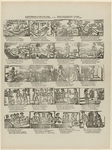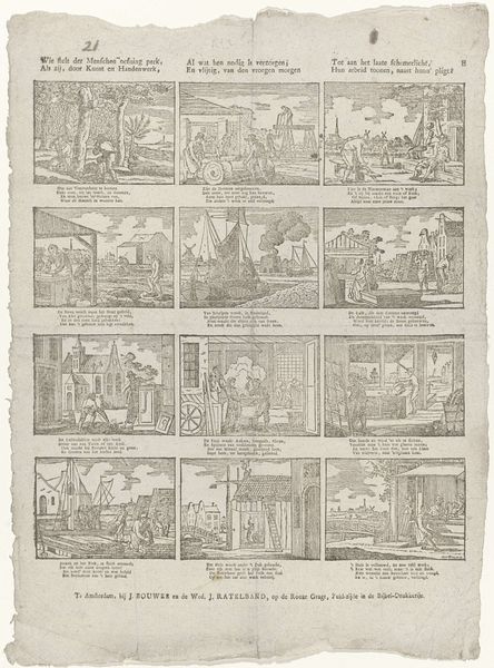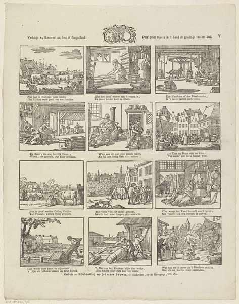 Curator: Here at the Rijksmuseum, we have a fascinating print titled "Spotprent op de plannen tot de oprichting van een Girobank, 1836," created anonymously in 1836. It's an engraving, a type of graphic art. Editor: My first impression? A flurry of monochrome frenzy. It’s chaotic and crammed with little scenes; like a proto-comic strip gone wild. Is it just me, or does anyone else sense a nervous energy humming from it? Curator: That energy is fitting, considering the subject: a satire of the plans for a giro bank in the Netherlands. It reflects a lot of anxieties around this new financial institution, anxieties that many felt in those days. Editor: Ah, context is everything. So, those overloaded figures carrying sacks towards a looming building represent… capital flowing into the bank? Are they willing or unwilling? Curator: That's the point; it is open to your interpretation, though I see them weighed down, which hints at the burden that finance can place on the common man. Consider the other panels: chaotic transactions, worried faces... there’s even a fellow burying himself in what looks like credit slips. It really taps into the public skepticism around this financial shift. It reminds me a bit of our modern day concerns with cryptocurrency. Editor: Right! It's poking fun, but also hinting at potentially darker implications. Is that ship sailing away in the corner a representation of money sailing away from Java, back to Europe? And how the wealthy laugh all the way to the bank! A truly multifaceted criticism with broad brushstrokes. I do wish I knew who made this print...to pick their brain on whether it succeeded as a deterrent! Curator: Its anonymity speaks to the risky nature of such direct criticism during that era. Whoever created this was taking a brave step in social commentary, which is what the political cartoon does, really, to great effect in many instances. Editor: Well, looking at it, I can definitely say its wit has outlived its moment! It still triggers thoughts on the balance of power and skepticism around banking.