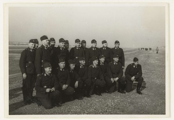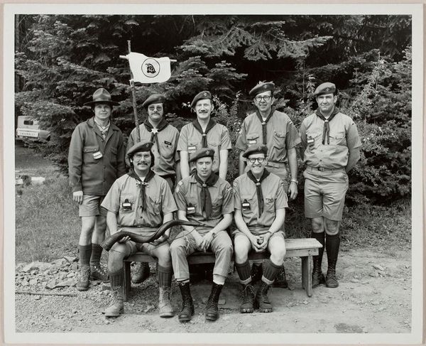 Editor: Here we have "Untitled (scout troop)" by Ken Whitmire Associates from the Harvard Art Museums. It's a black and white photograph of a group of…scout leaders? I’m struck by the formality of the pose, it feels both staged and a little absurd. What stands out to you about it? Curator: The photograph presents an interesting commentary on institutional identity and the performance of belonging. Notice the uniformity of the attire and the carefully arranged composition. How might this image function within the visual culture of scouting and its public perception? Editor: So, it's less about the individuals and more about what they represent? Curator: Precisely. Consider how images like these shape our understanding of organizations and their values through controlled visual narratives. It invites us to reflect on the politics embedded in seemingly straightforward group portraits. Editor: That's a great way to look at it! Thanks for sharing.