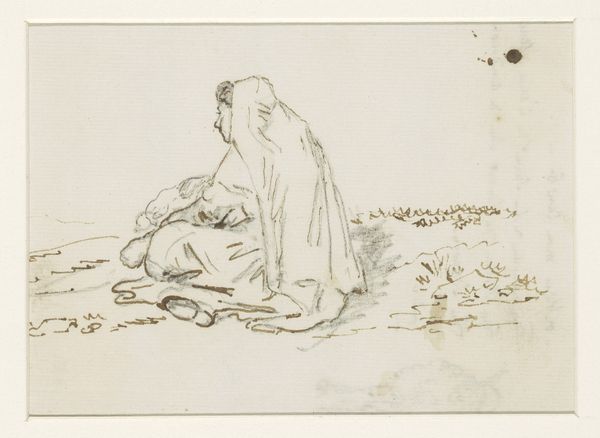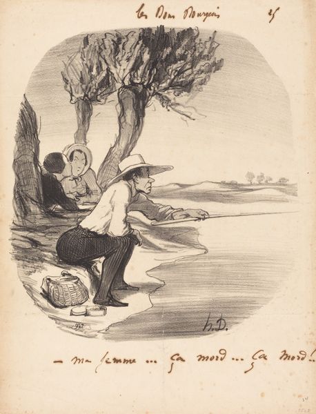 Editor: So, this lithograph is titled "An Oasis in the Middle of the Plain of St. Denis" by Honoré Daumier, created in 1847. There’s almost a comical melancholy to it – two figures seemingly lost in thought under this spindly tree in a wide-open space. What symbols or narratives do you think Daumier is trying to convey here? Curator: Notice how the seated man dominates the frame. He seems a parody of leisure, his top hat abandoned, suggesting perhaps, failed aspirations or interrupted industry. The title itself – "An Oasis" – feels ironic. Does this 'oasis' truly offer respite, or merely amplify a sense of isolation? Consider the cultural memory of such places, which have been a sign of hope and community through many mythologies and folklore. Editor: That makes sense. The woman sketching… is she finding something of value in this "oasis" that the man isn't? Curator: Precisely! What does creation offer as an emotional counterpoint to perceived lack, or to an incomplete image? Does she bring forth or reflect the spirit of the place and perhaps capture an alternative viewpoint through art? Daumier uses lithography to explore themes of longing, satire, and the human condition amidst societal shifts, questioning established visual traditions through popular imagery and critical reflections. How do these psychological, anthropological, and historical insights converge, offering deeper meaning? Editor: So the apparent simplicity really masks a complex commentary about society and the individual’s place within it. Thanks for unpacking that; it makes me appreciate it in a different light. Curator: It all makes sense when you begin to look at Daumier as a commentator, a man speaking about continuity using both words and images! It really speaks to cultural shifts!