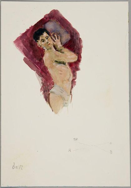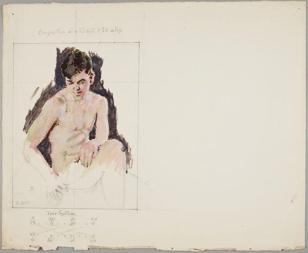 Editor: Here we see Denman Waldo Ross’s “Head and Torso of Male Nude.” It appears to be a watercolor study, focusing on light and shadow. I'm struck by the red background. What can you tell me about it? Curator: Well, nude studies served a vital function in academic art. They were a proving ground, demonstrating an artist's grasp of anatomy, form, and idealization. Consider how this study contributes to and perhaps challenges traditional representations. Editor: Challenges? How so? Curator: Look at the subject’s gaze, downward and contemplative. Does this divert the viewer's gaze from pure objectification to something more introspective? It seems a political statement about the male form in art. Editor: That's fascinating. I didn't consider how the gaze changes the power dynamic. Thanks! Curator: Indeed. It reveals how even in seemingly traditional exercises, artists engage with societal norms and expectations.