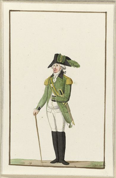 Curator: Look here—this delicate watercolor painting is called "Montering van het exercitiegenootschap van Schiedam," dating back to around 1787. The artist is unknown, but it now resides at the Rijksmuseum. Editor: It's surprisingly austere, isn’t it? Despite the obvious attention to the subject's attire, there's a certain formality, an almost rigid quality, about his stance. The limited palette feels intentional. Curator: Absolutely. Consider the social context: these "exercitiegenootschappen" were voluntary civic militias. Their uniforms, meticulously rendered here, were potent symbols of civic virtue and preparedness during a time of political tension in the Netherlands. The colors likely carried specific significance relating to their locale or affiliations. Editor: Speaking of which, I'm interested in how this watercolor emphasizes specific materials like the crisp linen of his breeches contrasted with the weight of the wool coat, lined no less! You can almost feel the difference in texture, hinting at a hierarchy expressed through fabrics and tailoring. Who would have been responsible for creating and maintaining these pieces? Curator: A pertinent question! Visual rhetoric and material reality intersect. His clothing speaks of both aspiration and belonging within this specific societal framework. Note his gaze – forthright and confident – it’s an assertion of status within the group. The sword and walking stick add to that visual vocabulary. Editor: I hadn't thought of that! The sword is somewhat concealed and appears more like an ornamental accessory. I like how the very act of representing fashion demonstrates the effort needed to produce the objects and reflects the tastes of its elite users and society's aspirations as a whole. Curator: And the watercolor medium lends itself to this meticulous recording of detail, it immortalizes not just a man but an ideal of citizenship and order. These paintings helped circulate certain ideologies visually. Editor: I agree. And seeing it as a carefully crafted object in itself provides added insight. Curator: Indeed, a small watercolor hinting at vast historical complexities. Editor: It’s fascinating how focusing on materials allows you to consider social histories.