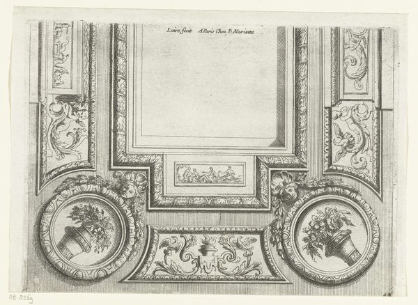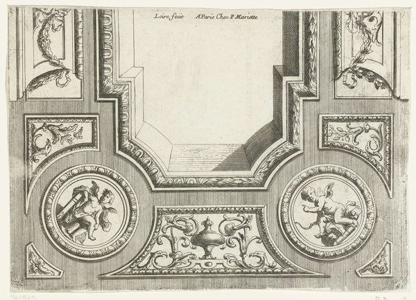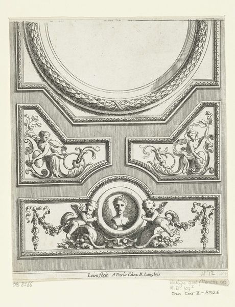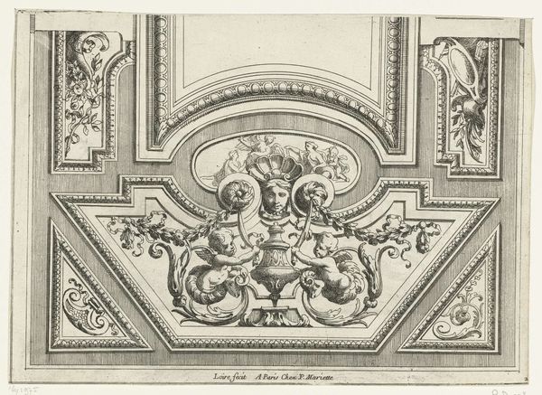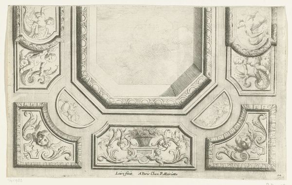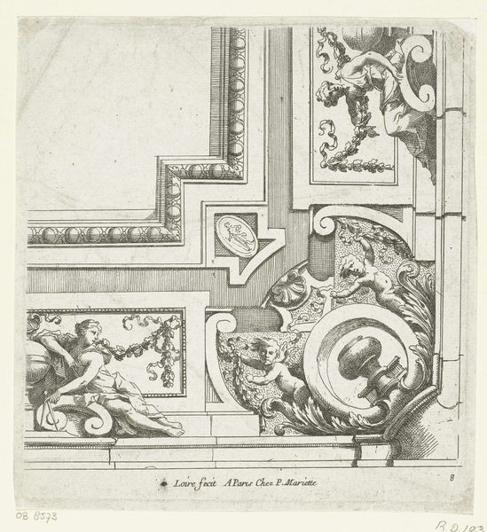 Editor: This is "Helft van rechthoekig plafond," or "Half of a Rectangular Ceiling," a pen drawing in ink, print, and engraving by Nicolas Pierre Loir, dating from 1634 to 1716. It’s currently held at the Rijksmuseum. The crisp lines give it an incredibly formal feel, like an architectural blueprint. How do you interpret this work? Curator: Observe how Loir employs line, specifically its variation in weight and density, to articulate form and depth. Consider the interplay between positive and negative space, and the function of line to delineate and contain allegorical figures. Do you perceive a hierarchy within the composition? Editor: I notice that the central figure with the vase is larger and more detailed, so I suppose she is the most important element. What about the repetition of circular motifs throughout the composition? Curator: The circular forms provide a visual echo, fostering cohesion and rhythm across the surface. Consider, too, how these repeated shapes contribute to the overall sense of order and balance characteristic of Baroque aesthetics. Note, further, how these lines evoke light and shadow through strategic hatching and cross-hatching techniques. This adds another layer of dimension and complexity, wouldn’t you agree? Editor: That's fascinating! The way the artist uses light and shadow really brings the figures to life. I hadn’t noticed all of that detail at first glance. Thanks for helping me understand what to look for! Curator: Indeed! Focusing on formal elements enriches one’s understanding. Remember, structure provides valuable clues to uncover the essence of an artwork.