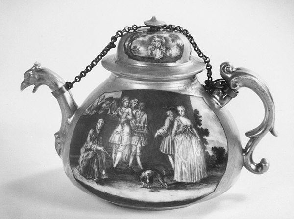 This mustard pot was made at the Meissen Manufactory, which began producing hard-paste porcelain in 1710. The vessel is slip-cast to create a perfectly uniform shape, enabling efficient production. Its surface is decorated with intricate monochrome painting, framed by gilded highlights to accentuate the fine details and forms. But this isn't just decoration; it's a display of the alchemical knowledge that Meissen brought to the European table. Porcelain production in this era involved a complex interplay of specialized skills, from mining and refining the raw materials to modelling, firing, and painting. The division of labor created stratified classes within the manufactory. Each worker contributed to the final object, yet few had control over the entire process. Considering this mustard pot reminds us that even everyday objects can be understood as the result of immense technical innovation and artistic labor. It encourages us to see ceramics not just as craft or design, but as significant cultural artifacts shaped by social, economic, and technical forces.
