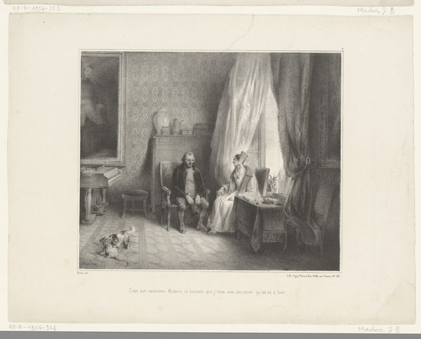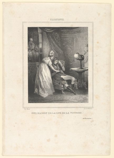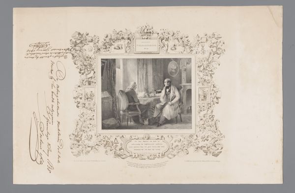 Curator: Jules David’s 1836 engraving, “Filantroop in gesprek met een priester”—Philanthropist in Conversation with a Priest—offers an intimate look at a meeting of minds. The work on display at the Rijksmuseum presents an interior scene rendered in delicate lines. What’s your first take on it? Editor: Stark contrast, definitely. The somber mood really strikes me, especially considering the suggested topic of "philanthropy." Is it intended to highlight tension between charitable ideals and the structures of religious power? Curator: Well, David was a printmaker producing images for mass consumption, and prints like these served a burgeoning middle class hungry for depictions of social life. The meticulous detail—see how each line is laid—speaks to the time and skill involved in its production. These images were reproduced, circulated, and consumed. Editor: I see how the print’s accessibility played a part. Looking closer, the contrast in attire stands out – one in darker, simpler garb versus the other in a more elaborate coat, subtly pointing to societal divides and challenging notions of charity within that power structure. Are we meant to question the motives here? Curator: That reading could be valid. The use of engraving also suggests a conscious effort to emulate traditional art forms while democratizing access. How does reproducing these scenes engage with traditional art hierarchies? Is it subversive or reinforcing? Editor: Subversion can operate at many levels. The artist chooses to depict, reproduce, and circulate an otherwise closed interaction, creating room for a wider reflection on charity and its effects. The very choice of subject feels like a conversation starter regarding power, class, and benevolence during that era. Curator: Interesting point. The materials themselves – the paper, the ink, the press – locate it firmly within an emerging industrialized culture, offering images as commodities to be purchased and exchanged. And this changed art-making entirely. Editor: Exactly, thinking about mass distribution expands my understanding of social commentary and engagement beyond the art world to larger movements concerning equality, social responsibility and moral expectations of wealthy elites. Curator: Thank you for those layered contextual considerations. Looking back now, I see it slightly differently myself, in part, to what you highlighted regarding tension. Editor: It’s fascinating how a look into historical context allows for a modern reading of societal patterns of thought. Let's take what we've learned here with us as we go forward.