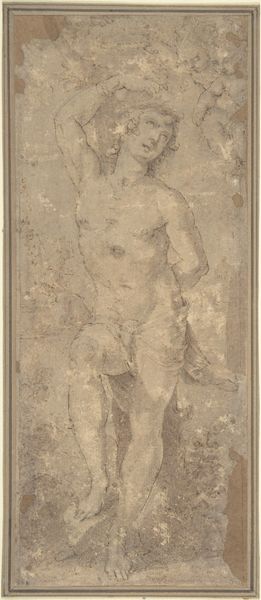 Giorgione created this drawing, *Putto Bending a Bow*, using pen and brown ink on paper. The monochromatic palette immediately focuses our attention on the forms and lines depicting a cherubic figure within an arched niche. The composition emphasizes the interplay between the curved lines of the niche and the figure's dynamic pose, creating a sense of contained energy. Giorgione masterfully uses line to define form and shadow, the hatching technique adding depth and volume to the figure. The cherub's posture, bending a bow, infuses the drawing with a sense of potential action, a frozen moment pregnant with narrative possibilities. This recalls the Renaissance interest in classical antiquity, where the body was the measure of all things. The drawing's strength lies in how Giorgione captures the essence of form through minimal means. This economy of line and shade allows the viewer to engage in a visual dialogue, completing the image in their mind's eye and drawing meaning from the interplay between form and suggestion.