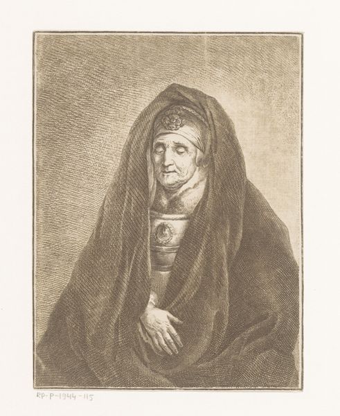 Curator: Here we have “Biddende oude vrouw (Rembrandt's moeder)", which translates to "Praying Old Woman (Rembrandt's Mother)," an etching dating roughly from 1773 to 1840. It depicts, as the title suggests, an elderly woman in prayer. Editor: She looks… profoundly tired. Her eyes are closed, and every line in her face seems etched with a story of hardship. But there's a deep sense of peace radiating from her, too. A quiet surrender, perhaps? Curator: Precisely. The use of etching allows for incredible detail, notice how each line contributes to the overall texture, conveying both the weight of years and a certain quiet dignity. Portraits like this provided an important form of cultural representation and social validation. Editor: I wonder about the social aspect here. I mean, imagining your mother immortalized in print is intense. Did he intend for this to be a personal homage or something more public-facing? Because those aren't always the same thing, you know? The politics of memory… Curator: A bit of both, probably! We have to remember portraiture served multiple functions back then, even intimate portrayals became social statements in print. The circulation of images helped define notions of respect, piety and virtue in the home. I like to think of it as offering us insight into family values back then. Editor: Right, so it's about more than just honoring Mom, it's about the artist performing an identity through this piece, participating in certain values and ideals that circulated at that time. Makes you think, huh? It makes the image more relevant and complicated. What's "intimate" if everyone sees it? Curator: Exactly, images create dialogue. Even if those meanings shift over time. Her stillness seems a universal visual representation that transcends time and background. But these visual representations often fall short on an intimate scale. Editor: And maybe that is why it is relevant still today. It's just that gap between inner and outer life that all of us can recognize… and which sometimes makes one a bit prayerful, maybe? Well, this print certainly gave me a bit to think about. Curator: As it should. It’s what great art achieves, bridging centuries to make us pause.