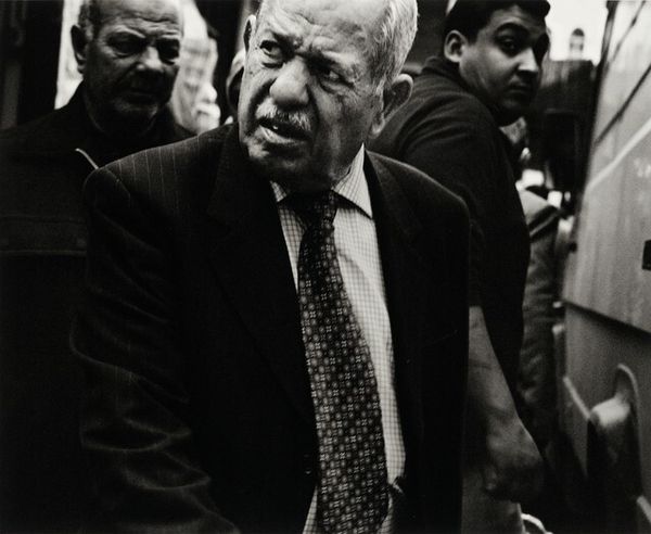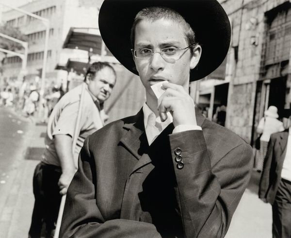 Curator: Leo Rubinfien’s photograph, possibly titled “Jerusalem, 2005, on King George V Street,” presents a striking snapshot of urban life. Editor: It's austere, almost stark, isn't it? The monochrome palette focuses the attention. What strikes me is how grounded in specific materiality and social context the image feels, as though excavated. Curator: Absolutely. The starkness amplifies the cultural and social dynamics at play. The young man in the foreground, wearing a kippah, becomes a signifier. What histories does his presence evoke? Editor: It also comes through, this is a gelatin silver print. Think about the production – the darkroom labor, the precise chemical processes – everything’s intensified under that material process. Is the grain deliberate? Curator: Perhaps a nod to documentary photography's traditions? Consider the symbolism of King George V Street – named for a British monarch, layered within the contemporary Israeli landscape. A potent juxtaposition. Editor: And even just the fact of a street bearing a foreign name—isn’t it loaded? Black and white flattens it. It almost implies the ubiquity of American or European material. How did Rubinfien manipulate that labor process, that visibility, to suggest themes of local tension? Curator: I wonder what internal conflicts the artist might capture with the monochrome decision; for him, it may suggest conflict between secularity and orthodoxy… Editor: That might speak to the global art market actually… This is very carefully mediated. Think of Rubinfien's role – capturing and presenting an ‘authentic’ vision of Jerusalem for a Western gaze and its consumption! That's labor, too. Curator: That’s a strong interpretation. It certainly asks the viewer to consider multiple narratives. His photos speak a more ambivalent language, rooted in personal journeys as well. Editor: I hadn't considered how personal this is… a refreshing insight, actually! Curator: The photograph leaves a haunting trace. It is so quiet and seemingly so personal… it stays with us.