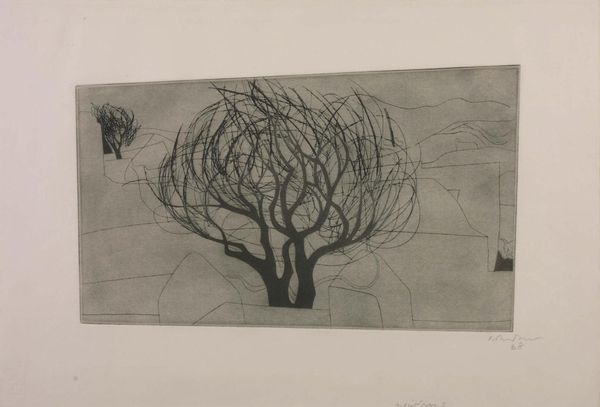 Editor: This etching, "Hex" by Stanley William Hayter, presents a network of sharp lines and shaded forms. The materiality of the printmaking process feels really present. What can you tell me about the making of this piece? Curator: This print pushes the boundaries between art and craft. Consider Hayter's conscious manipulation of the metal plate. How does his labor, his physical engagement with the material, inform the final composition? Editor: So, you're saying the visible process is the point? Curator: Exactly. We see the traces of the tools, the decisions made during production. The lines aren't just aesthetic; they embody the act of creation. Do you think that challenges traditional notions of artistic skill? Editor: I think I do see that, how Hayter's hands-on approach democratizes the art form. Curator: Precisely. It shifts the focus from the final product to the means of production. Editor: I'll definitely look at prints differently now, thinking about the physical process.