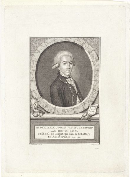 Curator: Let’s talk about this portrait of Paul Desforges-Maillard from 1756 by Pieter Tanjé. It’s an engraving, a print, and it feels so...formal, like a carefully constructed performance of status. I’m struck by the detail achieved through the engraving process. What can you tell me about this work? Editor: It’s interesting to think about the "means of production," as you say, and how that influences the reception. The image isn’t monumental; it is quite small. But that also allows for more replication. Can you tell me about what stands out to you? Curator: Immediately, I think about the socio-economic factors tied to printmaking in the 18th century. Who had access to these images? And how did that affect their perception of the sitter? The labour invested into the process, carving lines onto a plate to create a replicable image—it democratized art to a degree, but it also served to reinforce the social hierarchies of the time. It's baroque. How does the materiality of the print itself – the paper, the ink, the very act of reproducing it – change the meaning? Editor: I never thought about it like that. So, you are saying it's not just *what* is depicted but also *how* it's depicted that tells a story? Curator: Exactly! Consider the role of the artisan, the engraver Tanjé, and the network of workshops, the distribution chains. Were these workshops small family businesses, large production hubs? And for consumption, think about the print’s size, the accessibility, the modes of display: Did they paste it to the wall? Put it in a small cabinet of curiosities? And think about how that impacted people. The physical print connects us directly to those historical realities, to how it shaped a larger social reality. Editor: That's fascinating. It reframes how I see this; now I think about distribution. Thank you. Curator: Likewise! Looking closely at the material processes really changes your perspective, doesn't it?