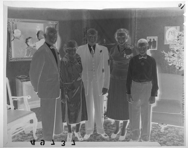 Curator: Oh, this photograph by Martin Schweig, titled "Untitled (two couples posing in living room in front of Christmas tree)," is interesting. It’s a small gelatin silver print, just 4 by 5 inches. Editor: It's so stark! The inverted tones give it a ghostly, dreamlike quality. There's something unsettling about these figures. Curator: Absolutely, that inverted tone changes our perception. The Christmas tree, usually a symbol of joy and warmth, becomes almost menacing. It reminds me of how we often invert or distort memories over time. Editor: And the two couples, they look so stiff, almost embalmed. There's a formal distance, despite being in a domestic setting. The tree has Christian imagery – a star – to signal good tidings. Curator: Perhaps Schweig was interested in the performance of family rituals, the way we stage ourselves for these photographs, even when the underlying emotions might be more complex. Editor: I agree, it is like a mask, not a true expression of feeling. This isn't a candid moment, it’s a constructed image. It makes one ponder the authenticity of the smiles we offer during the holidays. Curator: Yes, the image makes us consider the layers of meaning in seemingly simple family portraits. Editor: Indeed, more than just a holiday snapshot.