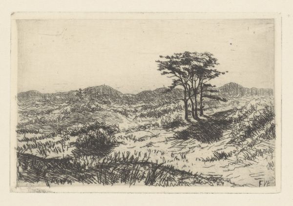 Art Historian: We’re looking at Louise Ravn-Hansen’s 1905 etching, "Skovrig skr\u00e6nt ned mod s\u00f8en," or "Wooded Slope Towards the Lake," housed at the SMK, Statens Museum for Kunst. Curator: It's remarkable. A symphony in sepia. The textures! I'm immediately drawn to the layering of the landscape and the density of those marks creating depth, light and shadow. Art Historian: Ravn-Hansen was deeply involved with plein-air painting, and printmaking offered her a portable method to capture these intimate landscapes on the go. It’s a reflection of the broader movement towards artistic independence at the turn of the century. Curator: Indeed. Look at how she's handled the perspective. The subtle recession of space through variation in line weight; that area where the trees cluster and become more vague as it approaches the horizon. The artist manipulates these forms and densities to trick our eyes. Art Historian: And considering the social context, Ravn-Hansen being a woman artist gaining recognition at the time highlights the shift in gender dynamics within the Danish art world. Curator: Absolutely, and the material itself-- the etching— adds so much to this. The fine, crisp lines almost vibrating against each other give it the airy yet detailed sense of observation. Art Historian: She really harnessed etching's ability to render details which resonates with Impressionist landscape painters like, Pissarro. She translated those ideals of immediate experience and careful documentation of nature into the print medium. This piece offers a serene vision in response to increased urbanization. Curator: The overall composition does encourage contemplation. There's almost a musical quality as each compositional aspect transitions, creating tonal variation through linear structures that makes the piece feel like gazing at it during sunset or sunrise. The atmospheric qualities she’s harnessed using pure graphic means are profound. Art Historian: And thinking about where this work sits today—in the collection of the Statens Museum for Kunst, it serves as an important historical record of a specific landscape and moment in time, but also tells us much about the cultural values assigned to nature and art making within early 20th-century Danish society. Curator: It's so subtle but incredibly refined and carefully thought through. Art Historian: Examining it through a historical lens offers crucial context for our understanding. Curator: And purely from its formal achievements. A treasure of etched line.