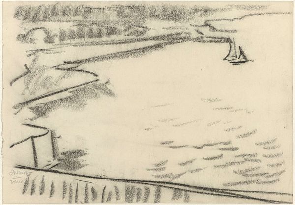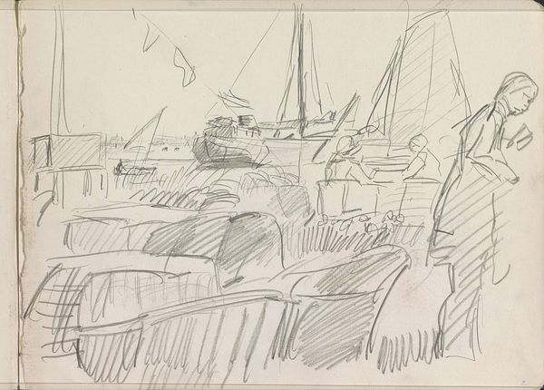 Leo Gestel made this drawing of sailboats with graphite on paper. He's working out some kind of cubic structure, a simplification of forms in the boats and the water. Gestel doesn't disguise the process. The marks feel immediate and searching. You can see how he's building up the image, line by line. The graphite creates a range of textures, from smooth, blended areas to rough, scribbled lines. Look at the way he uses short, horizontal strokes to describe the surface of the water. It’s like he's mapping out the light as much as the form. There is a tension between representation and abstraction; Gestel doesn't try to create a perfect illusion. It feels as if he wants to capture the feeling of being there, of seeing those boats in that light. Artists like Lyonel Feininger who were exploring similar ideas of abstraction and simplification, come to mind. It’s about embracing ambiguity, letting the drawing be a record of the artist’s thinking and seeing.