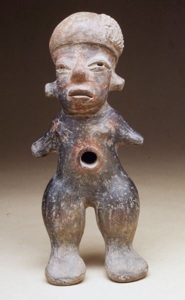 Curator: Here we have a striking earthenware sculpture entitled "Female Figure with Headdress," crafted by a Huastec artist sometime between 400 and 799 AD. What strikes you most about this work? Editor: The figure’s expression is what really captivates me. There is something so determined and grounded in her posture that resists conventional notions of pre-Columbian female representation, which can sometimes appear passive through our modern lens. Curator: Absolutely. The Huastec people, originating from what is now Northern Veracruz and parts of Tamaulipas in Mexico, imbued their artwork with rich symbolism, and this female figure is no exception. The headdress and ear spools, for instance, would have denoted status, perhaps indicating her role within the community or her connection to a particular lineage or deity. Editor: This raises the critical question of how gender and power operated within Huastec society. Was this figure meant to embody some idea of female empowerment? It's difficult to say for sure, but her assured stance suggests this was much more than just a decorative object. The material—the fired earth—is so central to its meaning, right? Clay possesses transformative qualities as an agent of ritual and record. Curator: Precisely. The ceramic medium carries layers of meaning in Mesoamerican cultures, often related to creation myths and the connection between humanity and the earth. The subtle traces of pigment also imply a vibrant artistic tradition that has unfortunately faded over time. I wonder about the colors... Editor: That's a good point. Reconstructing its original colors could completely transform our interpretation. The absence makes me wonder about the conditions of cultural loss that have shaped how we receive it today. And her gaze seems so confrontational—as though she is about to speak truth! Curator: And perhaps that is the key takeaway here: despite the passage of centuries and the loss of contextual information, the sculpture manages to project a sense of resilience and individuality, allowing for speculation on complex cultural issues of gender and status within an Indigenous American society. Editor: Indeed. It is a compelling testament to the enduring power of art to spark conversations across time and cultures, inviting us to confront our own biases and assumptions.