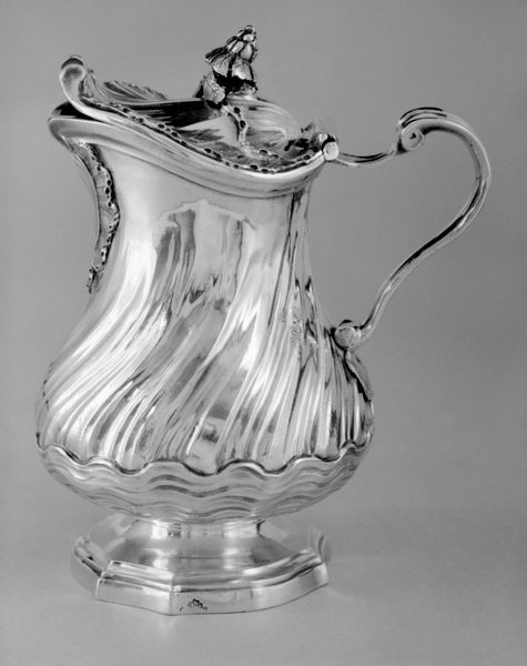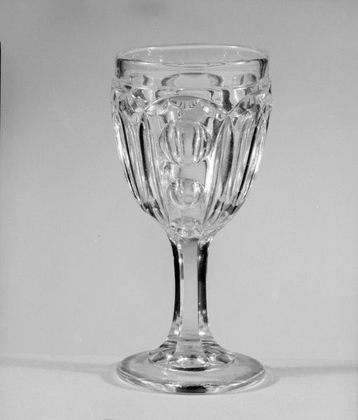 Editor: This is a glass Creamer made by the Portland Glass Company, dating somewhere between 1865 and 1874. I find its ornate design, especially the grapevine etching, quite elegant. How would you interpret this work? Curator: It's beautiful, isn’t it? Beyond the craftsmanship, I consider this creamer as a marker of the Victorian era's complex social landscape. Think about who would have used this: most likely middle to upper-class white families, aspiring to ideals of refinement and domesticity even amidst post-Civil War reconstruction, wouldn’t you agree? Editor: That's a great point. The refined design certainly speaks to a certain class and lifestyle. It's a far cry from the realities many Americans were facing. Curator: Precisely! Even the grapevine motif subtly points to themes of abundance and cultivation, intentionally mirroring American ideals, while side-stepping topics of industrialization, immigration, race, class…The everyday objects often mask entire portions of our history and culture. What else stands out for you? Editor: I notice the geometric cuts juxtaposed with the organic, flowing lines of the handle and the etching. There is a lot going on in such a simple object. Curator: Absolutely. These items of domestic décor become incredibly charged spaces when we see them this way. What’s important is this object asks more than answers. Next time you see an object like this, think, who owned it, where, and when, and you may find it has something to say. Editor: I see what you mean; I learned to consider how this cream pitcher reflects and shapes the domestic ideals of its time, hiding a very clear message. Curator: Yes, let's be critical when considering its function. The cream isn’t just a commodity, it has social dimensions tied to consumption and domestic ritual, even when contained by such elegance!
