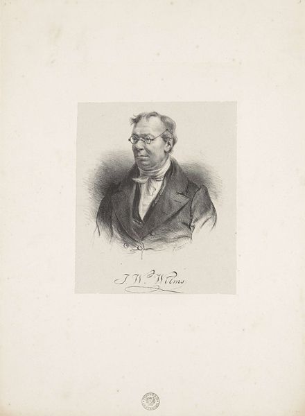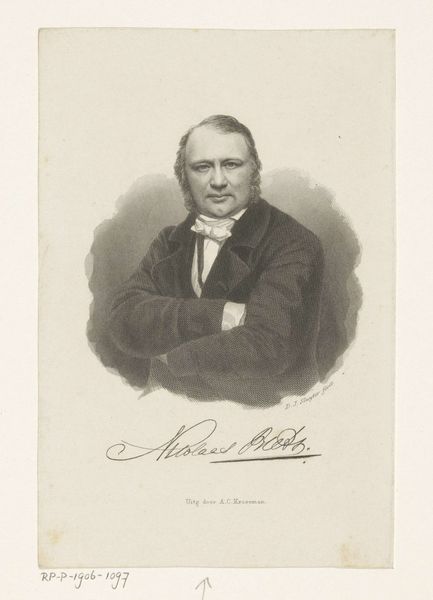 Editor: This is a portrait drawing of Nicolaas Beets, made with pencil between 1850 and 1883, by Adrianus Johannes Ehnle. It’s quite striking; his eyes seem to hold a certain melancholy. What do you see in this piece? Curator: The eyes are, indeed, key. Notice how they are rendered with such fine detail, contrasting with the looser treatment of the jacket. What emotions do you read? The subtle use of shadow around his eyes creates a sense of depth but also vulnerability. This drawing might echo societal shifts; a move away from overt displays of power towards inward reflection of the individual, mirroring perhaps the anxieties and intellectual ferment of the period. Editor: I see, it's like he's contemplating something serious, even troubled. Is that a typical sentiment portrayed in portraiture of this era? Curator: Not always, but the rise of Realism, and with it psychological exploration in the arts, sought to depict the subject “warts and all.” And beyond his expression, let's observe his clothing. A dark coat, buttoned high, and plain white shirt suggests restraint. Do these details signify something beyond mere fashion? Editor: Maybe a subtle commentary on his character, or social standing perhaps? Almost like a visual representation of his inner life? Curator: Precisely. Each carefully chosen element contributes to a narrative, inviting us to consider Beets’ intellectual standing and place in the rapidly changing world. Editor: This has been fascinating. I never would have considered reading the details like that. Curator: Paying close attention reveals a depth that encourages critical interpretation. There's always more to see than initially meets the eye.