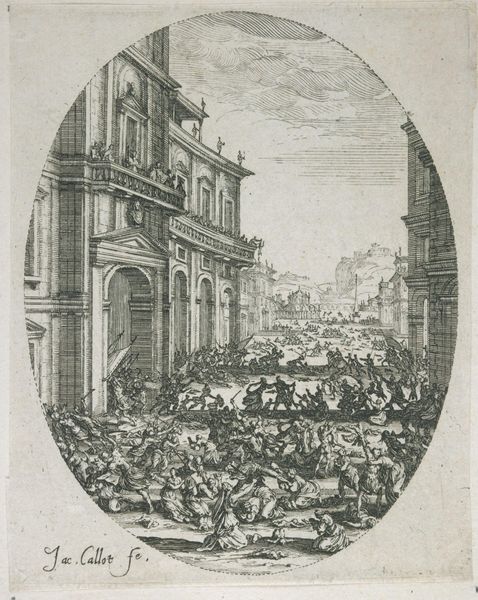 Editor: Here we have Jean François Janinet's, "The Pillaging of the Convent of St. Lazare (13 July 1789)." It looks like an etching or engraving. There's a real sense of chaos and unrestrained energy here. What jumps out at you when you look at it? Curator: The drama, of course! This piece captures a pivotal moment just before the French Revolution. The pillaging represents a breakdown of social order. Notice how Janinet uses light and shadow - almost theatrical, wouldn't you say? - to emphasize the violence. And those looming buildings... they're practically gasping at the audacity of it all! Editor: Yes, the high contrast definitely adds to the drama. I had not considered the theatrical light, that's interesting. Curator: Think of it as history caught in a spotlight, darling. Janinet isn't just recording; he's interpreting, inviting us to feel the tremors of a world about to change. Editor: It definitely feels like a turning point. There's so much raw emotion captured in that one little scene. Curator: Indeed. It is a reminder that art can be a powerful witness and instigator.