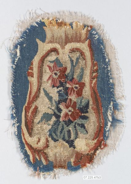 Editor: Here we have "Rocaille cartouche with flowers," made sometime between 1730 and 1755. It's a weaving of textile, and part of the collection at the Metropolitan Museum of Art. It looks almost like a fragment; the edges are frayed, but you can still see the floral design. How can we view a Rococo weaving with a critical eye? Curator: The fragmentation is crucial. Forget the flowers for a moment. Instead, focus on the weave itself, and consider its production. Beauvais, the presumed origin, was a major tapestry workshop. This wasn't ‘art’ in the high art sense but a commercial venture, dependent on skilled labor, a complex manufacturing process and access to dyes. Editor: So, the value isn't just in the design, but in the material production and social context? Curator: Exactly. Who made it? What were their working conditions? Who was buying these things? And for what purposes were such textiles used? Decoration, yes, but also displays of wealth, markers of social standing. How did the production of textiles mirror the development of mercantile capitalism in the 18th century? Editor: That shifts the focus. I wasn't really considering its function as a status symbol, and I also failed to reflect on the conditions surrounding textile manufacturing at the time. Curator: The floral design is beautiful, but think about where the materials came from. Were they locally sourced? What about the labor? What kind of social relationships were needed to create such textiles? This cartouche presents not just an aesthetic object, but the evidence of its complex production, and all the human involvement which supported it. Editor: Thanks, that really gives me a new way of approaching the piece. I will have to focus more on the background instead of the motif. Curator: Precisely. Keep digging into the processes and conditions of making, and you’ll be surprised what this textile reveals.