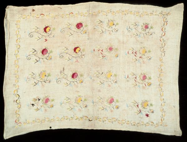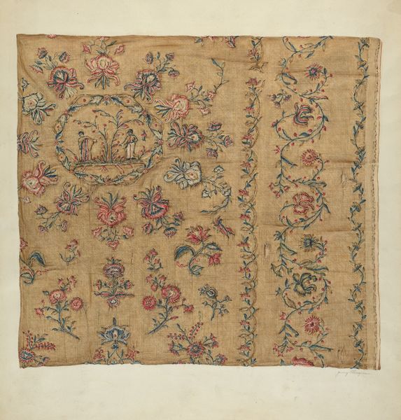Editor: This is a crewel embroidered bedspread from around 1941, created by Suzanne Roy. It’s beautiful, and has this handcrafted, folksy feel, and all these lovely botanical and floral designs scattered across the surface. What stands out to you about it? Curator: Well, immediately I see the incredible amount of labor embedded in this textile. Consider the sourcing of the materials – the wool for the crewel, the linen or cotton for the ground cloth, even the dyes used to create the colours. Each component speaks to a specific economy and set of processes. Editor: I hadn’t thought about it that way! Curator: And think about the maker, Suzanne Roy. What was her social position? Was this piece a product of necessity, a decorative flourish, or perhaps both? The repetitive act of embroidery can also be interpreted as a form of labor, especially if viewed from a feminist perspective. Editor: It makes me wonder how much time she spent creating it, and what her everyday life was like. Curator: Precisely. And the use of "crewel," a specific type of wool yarn, is also important. Why that material? What were its properties, availability, and cost in relation to other fibers at the time? How does this material choice influence the overall aesthetic and durability of the bedspread? Editor: That’s fascinating. I initially just saw pretty flowers, but you've shown me how the materials themselves tell a story about labor, resources, and even social context. Curator: Exactly. By focusing on the materials and processes, we can move beyond a simple aesthetic appreciation and understand the artwork as a product of specific material and social conditions.
