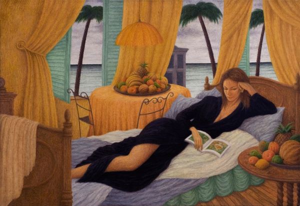 Iwo Zaniewski’s ‘Rainy Day Painter’ is executed in colored pencil with meticulous and almost obsessive attention to detail. This medium, often considered a children’s tool, is here employed with the serious attention normally reserved for oil paint. Look closely and you’ll see the labor involved. Zaniewski has patiently built up an image of surprising complexity, depicting an artist painting a woman who is herself reclining and reading, with a landscape visible through the window. The repeated application of delicate lines gives the painting a distinctive texture, a kind of all-over density reminiscent of textiles. There’s a surreal effect to the work, as every object and surface is given equal attention, flattening the hierarchy between foreground and background. The effect is something of an optical illusion. We’re drawn into the represented scene, but also constantly reminded of the painstaking work that has gone into its making. By embracing a medium often deemed low-status, Zaniewski invites us to reconsider our assumptions about skill, labor, and artistic value.