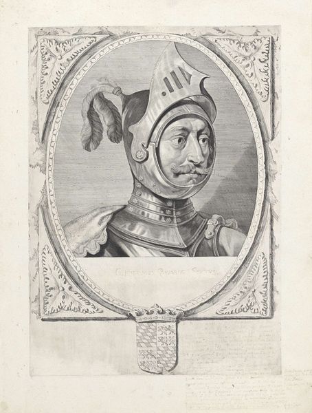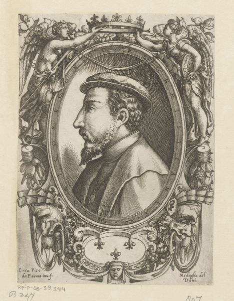 Camillo Cungi's "Portret van Johannes III, koning van Portugal" is a striking testament to the power of line and form in portraiture. The etching presents a framed portrait of King John III, meticulously rendered with close attention to detail. Cungi uses a semiotic system of signs to construct an image of power. Note the ornamental frame around the central portrait, elaborately decorated with swirls and flourishes. These elements function as cultural codes that enhance the subject's status, emphasizing the King's importance. The geometric precision of the lines contrasts with the organic shapes of the decorative elements. This interplay suggests a tension between the rational order of governance and the unpredictable nature of power. The artist destabilizes conventional portraiture by situating the King within a framework that simultaneously celebrates and questions the nature of authority. Observe how the formal qualities of the artwork—its lines, shapes, and composition—function not just aesthetically, but as part of a larger cultural and philosophical discourse on power, representation, and identity.