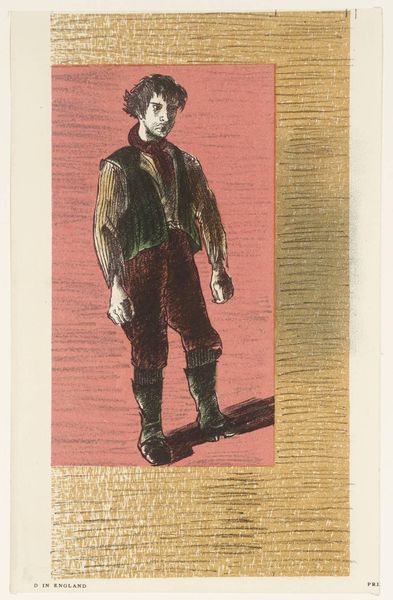 Editor: This untitled print by Barnett Freedman presents a figure in a long coat, framed by textured borders. I'm struck by the hands—they seem almost detached, gesturing towards something unseen. What symbols or cultural references do you observe in this work? Curator: The coat itself is a powerful emblem. Consider its historical context: the long coat often signifies authority, intellect, or even a certain social standing. What does its somewhat faded, almost spectral, green hue evoke for you? Editor: It makes me think of a melancholic figure, burdened by the past perhaps? Curator: Precisely! And note the abstract background, it’s like echoes or ripples. It is tempting to see this as a visual representation of inherited memory, with the figure caught within its currents. The past is never truly past, is it? Editor: I hadn't thought of it that way. It's incredible how many layers of meaning can be embedded in a single image. Curator: Indeed. Freedman uses visual language to tap into our collective consciousness.