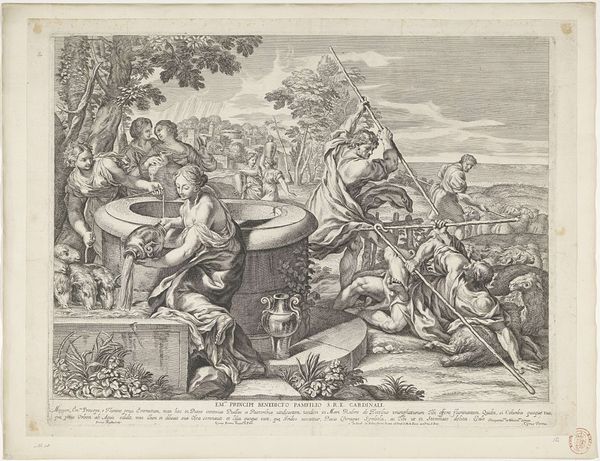 Curator: Ah, yes, Jan (II) Smit's engraving, "Allegorie op de verheffing van Willem IV," created in 1747. A flurry of activity isn’t it? It looks like an allegorical depiction connected to William IV's rise to power, showcasing a particular moment in Dutch history through the reproducible medium of print. Editor: Whew! Overload. It looks more like a political cartoon, an enthusiastic mess of symbols wrestling for attention. My first thought is—busy! Curator: Indeed. Smit uses the print medium here not just to decorate, but as a crucial mode of communicating political sentiment widely. Note the deliberate linear quality achieved through engraving; the stark contrast lends immediacy to the subject and promotes clarity. Think of the accessibility! Editor: The more I look, the more those precise lines resemble barbed wire. A lion, a rooster, what’s that...a dragon?—they’re all jammed behind a wall! Are those the "good" animals hemmed in, and is William about to burst through and free them? Curator: It's more layered than that, naturally. The menagerie you mention serves as symbolic representations of political factions, the impending ship an emblem of trade, each element woven into a narrative about the political climate surrounding William IV. The materiality of the engraving, the availability of its message to multiple viewers… It all speaks to an engagement with shaping public opinion. Editor: I see a female figure elevated, literally, on what looks like a castle turret; cherubs dancing overhead. Is this glorifying Willem? Or, through caricature and this almost comic book style, offering sly criticism? The print *itself* becomes the method. Curator: Precisely! The mass-produced nature, its accessibility in terms of cost and widespread distribution…it implicates the *viewer* in that moment, too. They are meant to become active participants in processing and propagating this very specific viewpoint. Consider this print a cog in a much larger apparatus designed to galvanize a nation. Editor: Right, this wasn’t some rarefied painting hung in a palace, but essentially visual propaganda accessible on the streets. So, this chaotic swirl of meaning was meant to reach as many eyes as possible and drive home a message through symbolism anyone could quickly grasp. A vital point in its own distribution and social context. Curator: Exactly. Looking closer at process helps us re-imagine the potent capabilities inherent to visual culture of this era. Editor: I guess it just reveals the artfulness often lurking beneath supposedly objective historical documents. Now, that gives me even more to think about...