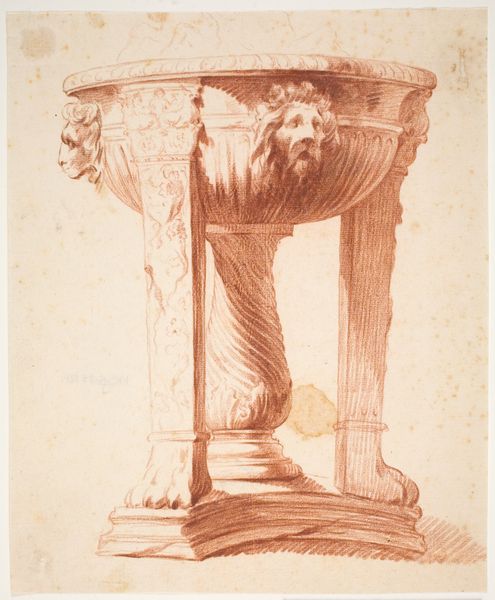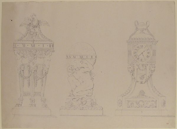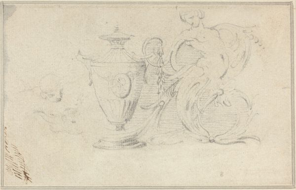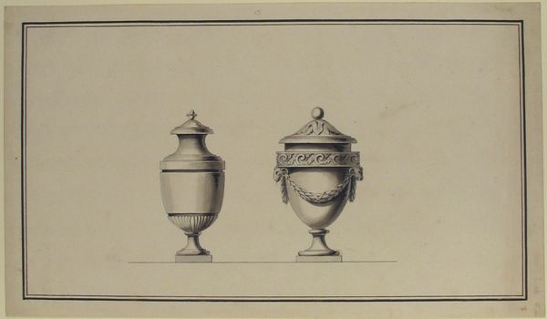 This is a drawing of designs for two vases made by an anonymous artist, location unknown. Executed with reddish-brown ink, the artist explores symmetry, proportion, and surface decoration. Note how each vase is distinct in shape and ornamental details; one is round with figures atop, the other, more angular, features classical motifs. The use of a single color creates a uniform texture, emphasizing the form rather than the color. Light and shadow are suggested through varied line thickness, adding depth. These designs exist not merely as functional objects but as cultural artifacts, reflecting classical tastes and artistic skill. The linear precision and balanced composition, alongside the monochromatic palette, invite us to consider how form and decoration intersect to create aesthetic meaning. The vases embody both utility and artistic vision, capturing the essence of design.