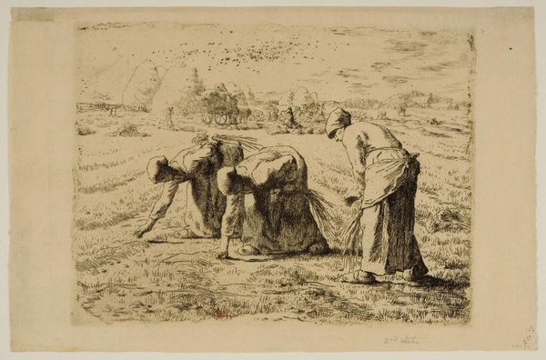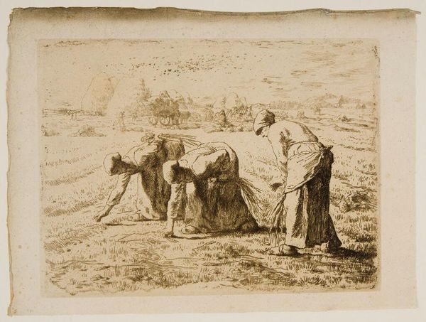 Curator: Before us is Jean-François Millet’s pencil drawing, “Étude pour les glaneuses.” The scene captures figures working in a field. What are your initial impressions? Editor: It hits you with a stark sort of realism. Not polished, not romanticized. You feel the weight of labor; the women are bent, strained... digging at existence. It has an unvarnished truth, maybe a kind of humble dignity. Curator: Yes, the composition directs our eye low to the ground, emphasizing their task. The formal arrangement presents an interesting visual argument of hierarchy between those harvesting, and the scale of what remains after harvesting. Notice the line quality. What semiotic observations might you venture about this stylistic choice? Editor: Well, the figures are drawn with strong, decisive strokes giving form to physical presence. Meanwhile the landscape kind of dissolves, becoming all suggestion and air. Like the only reality is the aching back and dirty hands, maybe the sun pressing on skin, you know? It makes you wonder, what stories lie beneath those shawls and skirts? What do they dream of at night after such a grueling day? Curator: The loose, gestural lines effectively portray movement and atmosphere. You see the figures aren’t rigidly defined, imbuing this scene with fluidity and a very transient aspect of human activity embedded in the natural cycle. Editor: The details sort of…emerge rather than declare themselves. Reminds me of a half-remembered dream. There's a beauty in that rawness that escapes something more sculpted, almost like what's captured isn't the activity of working the field, but a distillation of the work. And maybe those are the same things. Curator: Precisely. It encourages a contemplative engagement; less spectacle, more soul. A rendering, not just of labor, but of laborers and the essence of existence they share within it. Editor: A lot of humility and poetry. Hard work transfigured by seeing. Maybe beauty doesn’t demand grand landscapes or noble figures. Curator: Maybe its most profound form is revealed in the simplest, most essential aspects of life. Thank you.