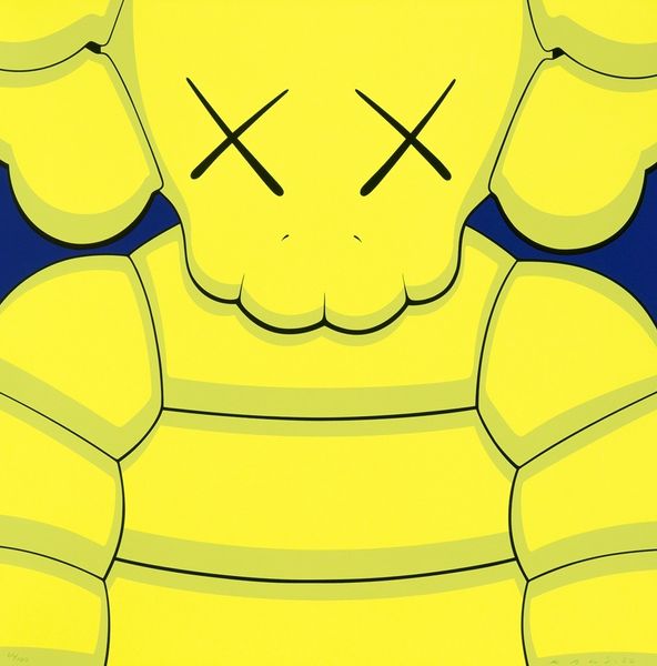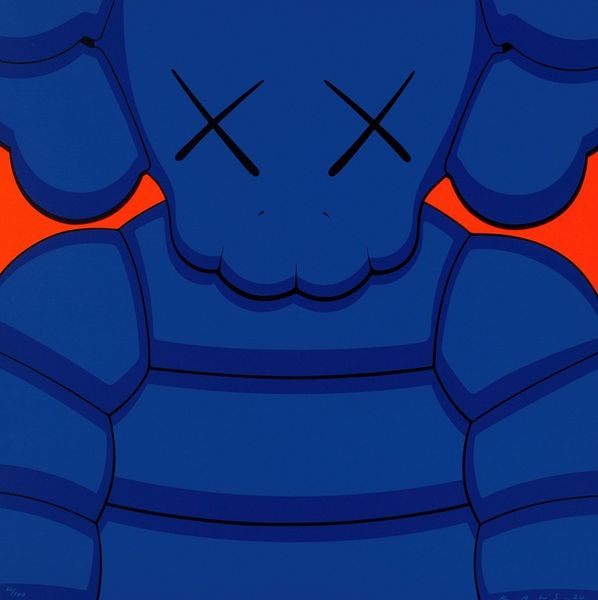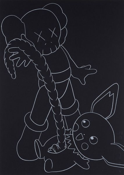 Here we see Companion-Bus Stop, an artwork by Kaws, rendered in stark black and white. The figure dominates the frame with simple, bold lines and shapes, immediately capturing our attention through contrast and scale. The smooth, matte black background intensifies the impact of the white outline, forming a figure that is both cartoonish and unsettling. The crossed-out eyes, a signature of Kaws’s characters, disrupt any sense of familiarity or empathy. This visual signifier, a basic semiotic element, raises questions about contemporary culture, where symbols often overshadow genuine expression. This use of bold outlines against a solid background engages with discussions about appropriation and recontextualization. Kaws takes familiar cartoon imagery and subverts it, challenging fixed meanings and engaging with broader artistic and philosophical concerns about modern alienation. Consider the artist’s strategic use of the black and white palette, it underscores how fundamental artistic choices create meaning, inviting ongoing interpretation.