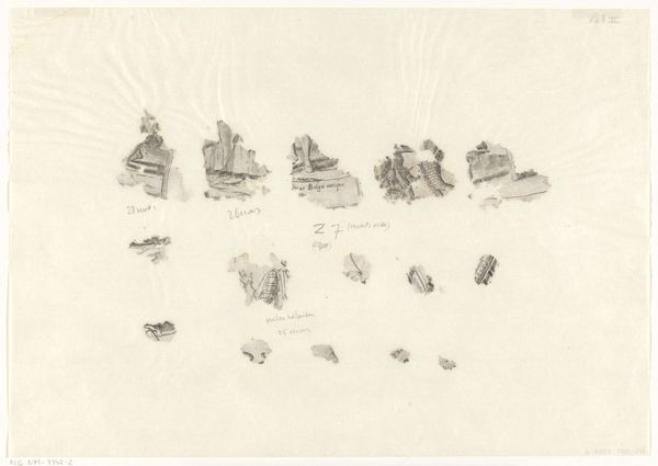 Editor: Here we have *Fragmenten van prenten met wereldlijke en geestelijke klederdrachten*, or Fragments of prints with secular and religious clothing, created between 1581 and 1596 by Abraham de Bruyn. It's at the Rijksmuseum. It looks like a page of studies or perhaps even discarded scraps. What strikes you about it? Curator: The apparent casualness is interesting, isn’t it? We’re seeing the backside of artistic labor. This wasn’t meant for public consumption, but it reveals the artist's process of image production. Note the deliberate use of easily available and cheap materials: paper, pencil and what seems like simple washes of watercolour. These are the ingredients, the raw matter, if you will, of creating those highly detailed prints. What do you think De Bruyn might have been planning with these figures? Editor: Perhaps patterns for some series of prints? Was this standard practice at the time? Curator: Exactly. Consider the economic system. Printmaking at the time was increasingly geared toward a market. So De Bruyn isn't just an "artist" in the romantic sense; he’s a producer, generating designs that can be replicated and sold. He may well have been designing specific outfits in relation to class. The fragmentary nature suggests, in my mind, something in progress or even abandoned for economic considerations. Do you agree? Editor: Yes, that makes perfect sense. Seeing the individual sketches, instead of the final polished product, really shifts the focus from the artistic genius to the work itself. It highlights the labor and commercial aspect. Curator: Precisely. And from that labor emerges a new means for ideological circulation. The clothes denote the means of material production, as much as their wearers do. Editor: I never thought of it that way, it makes me see it in an entirely different context now!