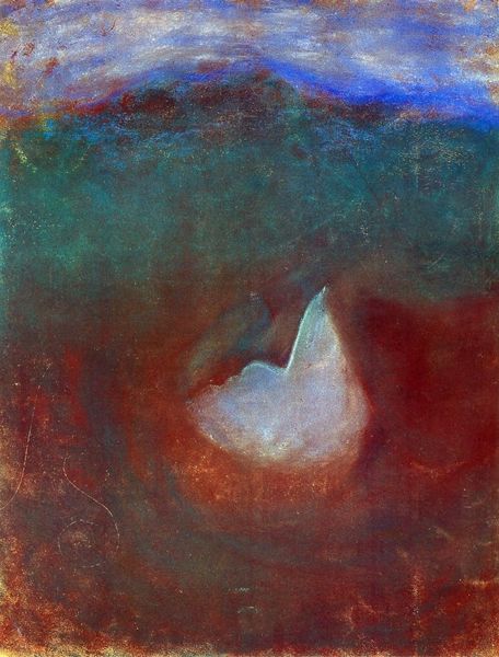 Editor: This is an untitled piece by Zdzislaw Beksinski, a painting with layered matter-painting techniques that really catches the eye. It presents an ambiguous and almost haunting visual. What are your initial thoughts on this work? Curator: It is immediately striking how the chromatic scale dances through the registers. Notice the vibrant hues of yellow modulating into verdant greens, with these striking azure and cerulean interventions. The tonality establishes the foundation of our interpretation, don't you think? Editor: Definitely, there is also something disturbing with the hands covering the breasts. Is it supposed to convey violence? Curator: Let us turn back to the structural aspects. Is violence explicit within the forms themselves? Are the angles sharp, are the lines broken? No. The composition utilizes a centralized, almost iconic, presentation, but its affect resists closure. Do the rounded forms and soft modeling indicate anything about Beksinski’s process here? Editor: So you're saying that focusing on the forms gives clues about a potentially contrasting idea, rather than simply accepting my violent reading of the subject? Curator: Precisely. It subverts straightforward allegorical or symbolic readings by presenting forms that exist between states: visibility and concealment, figure and ground, smoothness and texture. Look closely at how Beksinski employs underpainting. How does this affect the interpretation? Editor: I see, the underpainting softens the contrast, creating a hazy, dreamlike effect. Curator: The genius of Beksinski lies in his mastery over materials and methods. Our formal analysis offers keys for unlocking interpretive possibilities within what could, at first, feel inaccessible. Editor: This has truly expanded my approach to evaluating art.