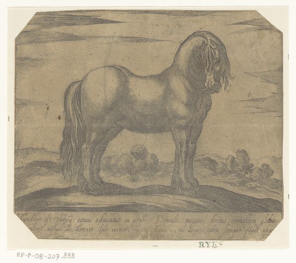 Antonio Tempesta created this print, "Standing Horse with Head Down, Turned to the Right," sometime between 1555 and 1630. Notice how the stark lines and shading create a somber mood. The horse, massive and weighty, dominates the composition, its bowed head conveying a sense of weariness. The detailed cross-hatching defines the musculature of the animal, lending a tactile quality that contrasts with the ethereal landscape. Look how the artist used the lines to build form and texture, from the horse’s mane to the distant, stylized cityscape. Tempesta’s technique reflects a fascination with structure and form, engaging with contemporary philosophical interests in perception and representation. The subdued tones enhance the sense of weight and presence. It reminds us that art is not just about depicting a subject but also about exploring how visual elements can communicate ideas, inviting us to question and reinterpret the relationship between form and content.