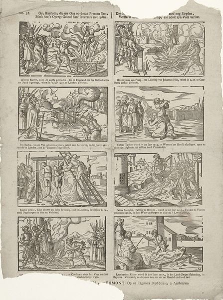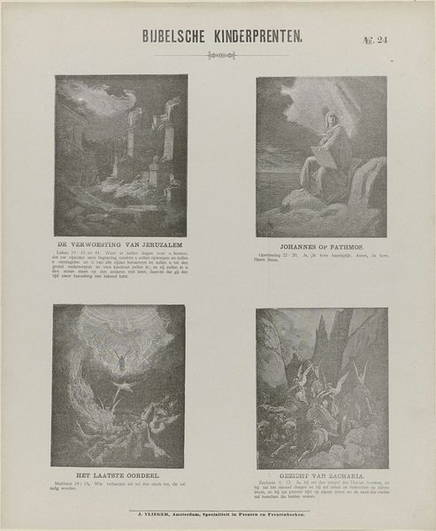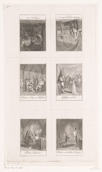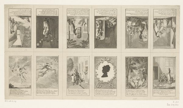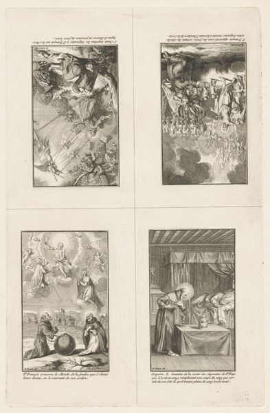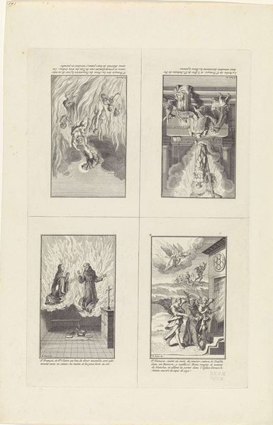 Curator: This engraving from 1734, by Bernard Picart, presents “Scènes uit het leven van Heilige Franciscus van Assisi”—scenes from the life of Saint Francis of Assisi. The print is currently held here at the Rijksmuseum. Editor: It strikes me as rather ornate, even overwrought. The composition feels cluttered; each of the four scenes vie for attention with dramatic gestures and excessive detail. Curator: That aligns with its Baroque style, emphasizing dynamism and emotional intensity, particularly apt for conveying the drama of Saint Francis’ life. What do you make of the narrative construction? Editor: Visually, I find the sequencing illogical, if I'm being frank. My eye darts all over, trying to piece together the intended sequence. Each vignette contains similar patterns of light and shadow but fails to establish a rhythmic viewing order. Curator: Indeed, Picart, though skilled in engraving, perhaps prioritizes conveying specific moments over cohesive storytelling. Saint Francis was, after all, a significant figure in religious history; his representation here echoes Counter-Reformation art intended to reinvigorate Catholic piety through powerful imagery. Editor: Note how Picart employs a tight, linear execution to achieve complex tonality with a reduced palette. Each area pulses with textural differentiation. I especially enjoy how he rendered the diaphanous robes of those figures in heaven. Curator: He’s certainly working within established iconographic traditions, presenting familiar hagiographic narratives with theatrical flair, designed to engage a wide audience during a time of intense religious and political transformation. Editor: While I concede its cultural importance and appreciate Picart’s technique, for me the overall effect remains chaotic and disjointed; visually it has none of the focused elegance of later movements. Curator: Your formal reading underscores a broader shift in artistic values, marking a transition towards clarity and compositional rigor. Meanwhile, prints such as this showcase the period's fervent visual culture with enduring cultural and religious resonance. Editor: Exactly, it is these tensions that inform and enhance the artwork’s appeal today.