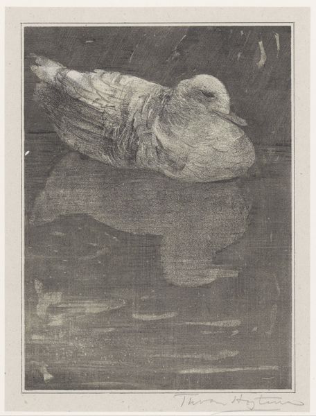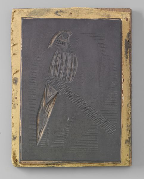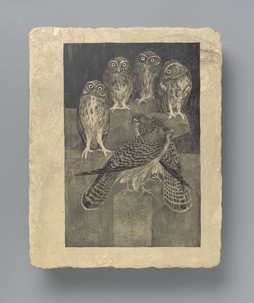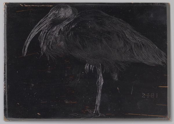 Curator: Standing before us is "Roofvogel" by Emilius Wilhelmus Dehé, an artwork dated sometime between 1916 and 1947, currently held at the Rijksmuseum. It appears to be a print, made using graphite on some sort of ground, and rendering a rather imposing bird of prey. Editor: Oh, it’s haunting, isn't it? The dark ground, and then the meticulous, almost obsessive detail in the feathers—it feels like the artist really wrestled with this creature's likeness. A bit ominous, really. Curator: The 'Roofvogel', literally 'bird of prey', possesses powerful symbolic resonance. Birds in art often represent freedom, aspiration, the soul’s journey – but a raptor... well, it complicates those notions, doesn't it? The sharp gaze and strong beak signify power, aggression, a hunter's instinct. Consider how those qualities might reflect the era in which it was created. Editor: Absolutely! It is an era shadowed by two world wars and the rise of oppressive regimes. That penetrating stare could easily represent vigilance, the necessity to see clearly in the face of looming darkness. Or maybe the artist identified with this fierce creature in times of turmoil? It is easy to fall down these speculative rabbit holes. Curator: Or consider, more broadly, the enduring cultural association of birds of prey with leadership, courage, and the strength to overcome adversity. Eagles, hawks, falcons… they've all held elevated status across different civilizations, embodying attributes to be admired and emulated. But look how the detail emphasizes the isolation of that creature! Editor: Exactly! It feels like this hawk—or whatever it is—isn’t soaring majestically above the world; it's perched on some shadowed branch, almost imprisoned by the frame, a poignant paradox of might confined. You've got these minute scratches capturing every contour, but instead of celebrating power, it evokes confinement! Curator: A fascinating reading. It invites us to ponder the layered symbolism inherent within the image, beyond straightforward interpretation, challenging conventional association of raptors. It really leaves quite an afterimage, don’t you agree? Editor: Absolutely. Makes you question your own assumptions about power and freedom.